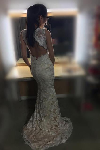 2024 Sheath Sleeveless Open Back Mermaid Lace V-neck Sweep Train Wedding Dresses RS292