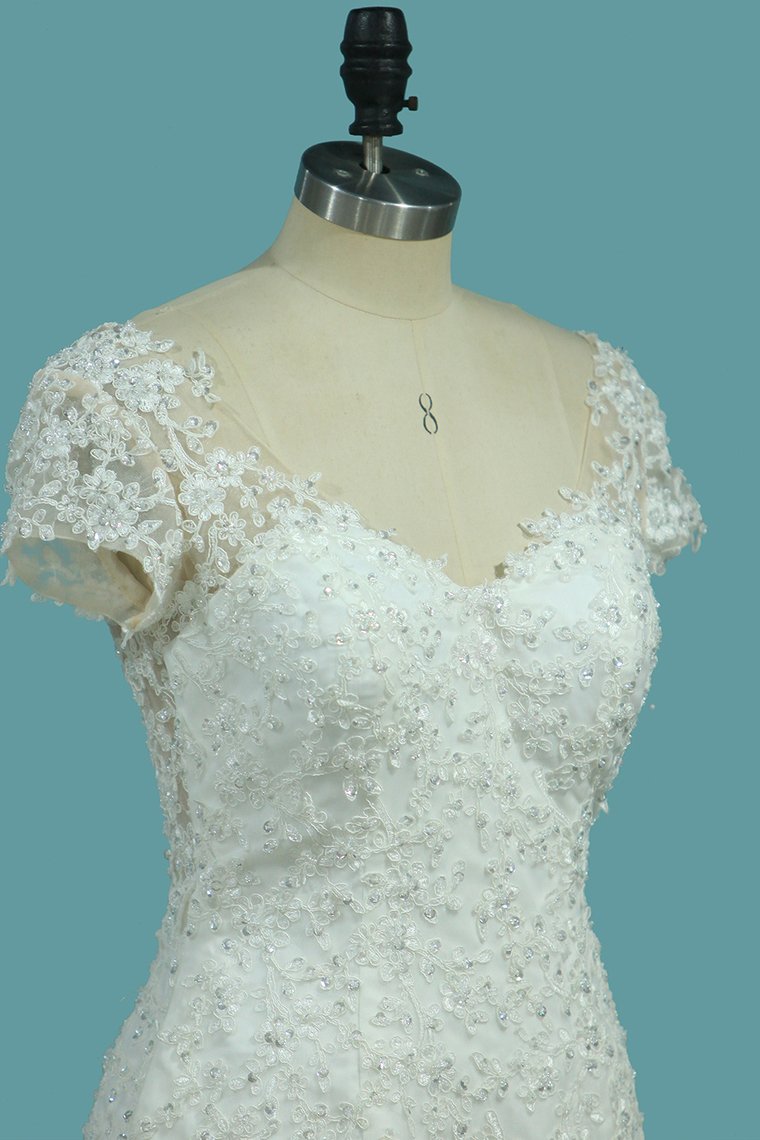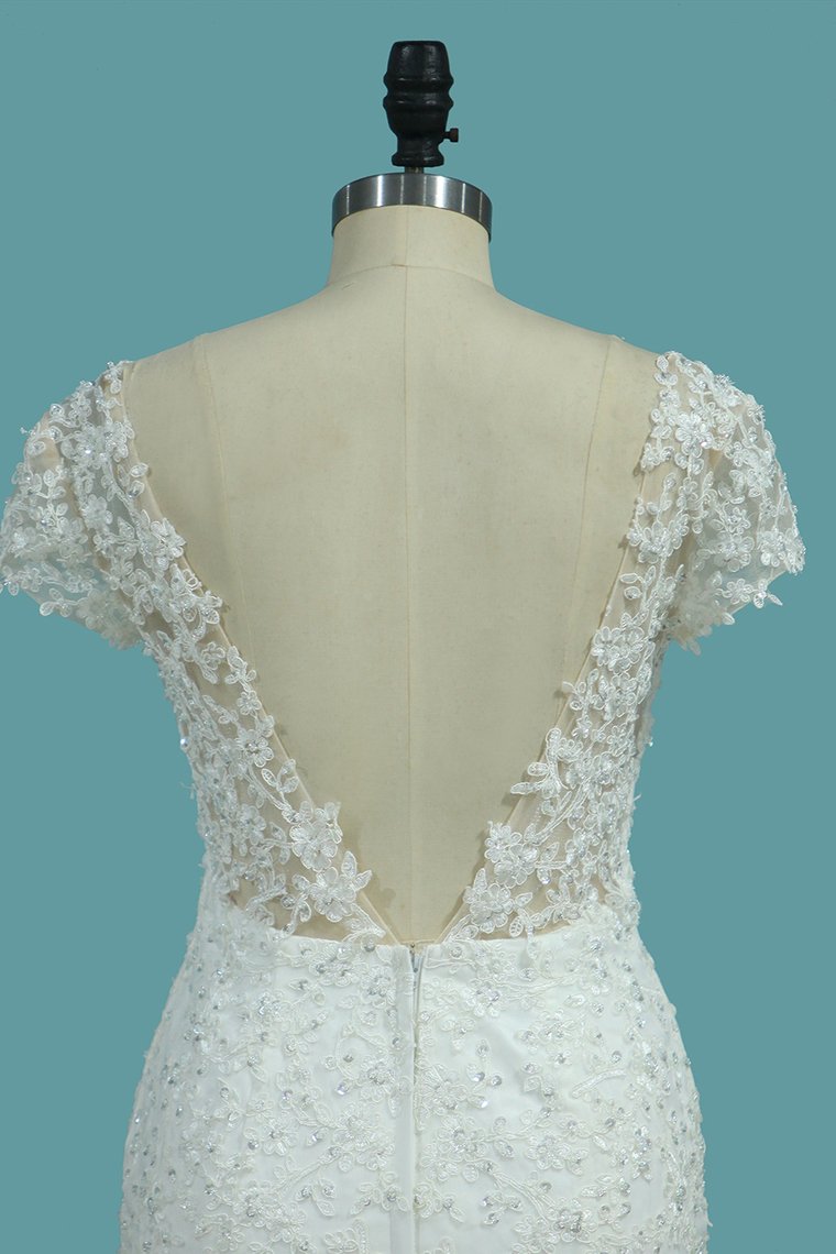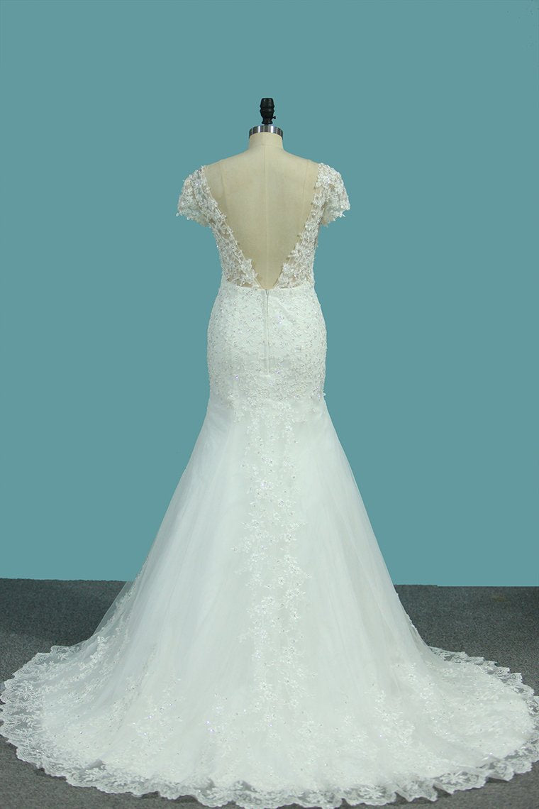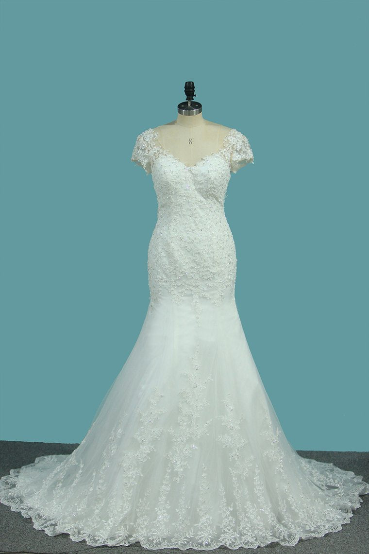2024 Short Sleeves V-Neck Tulle Mermaid/Trumpet Wedding Dresses With Applique
