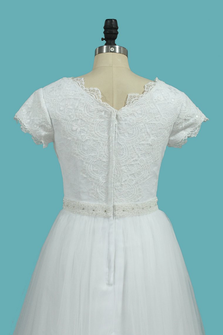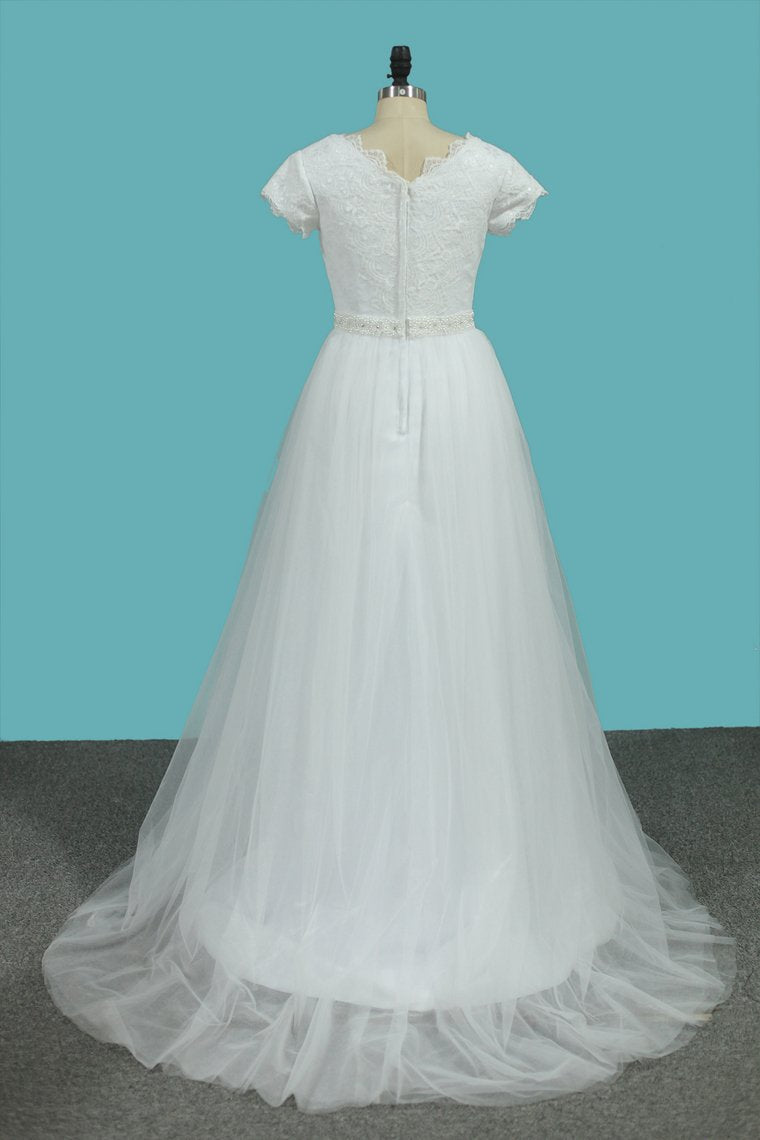 2024 Short Sleeves V Neck Wedding Dresses Tulle & Lace With Beading
