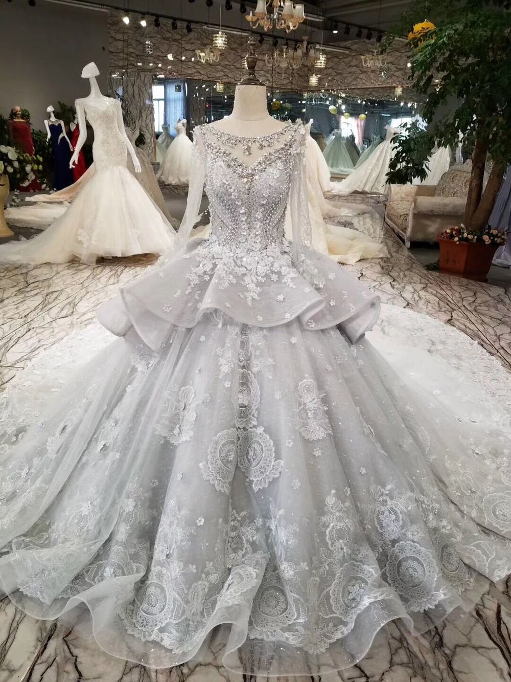 2024 Silver Wedding Dresses Ball Gown Long Sleeves Royal Train Top Quality Lace With Applique & Beading
