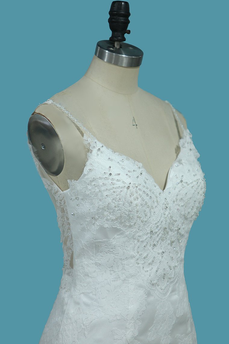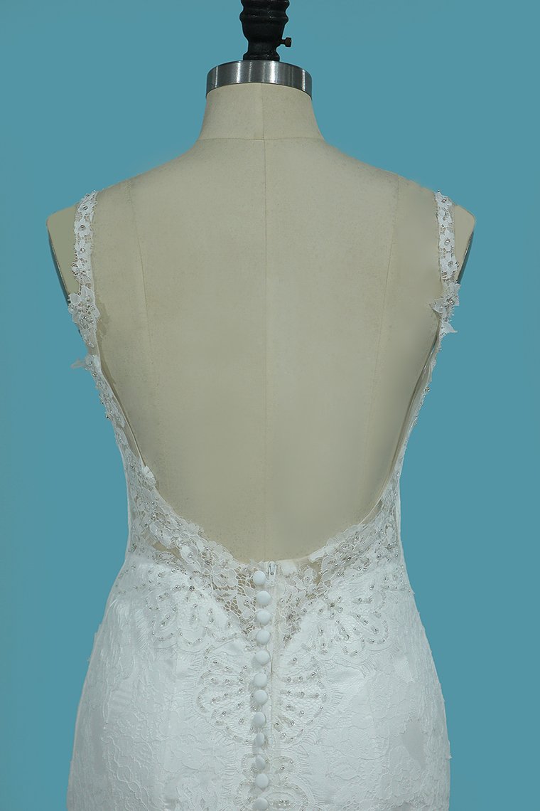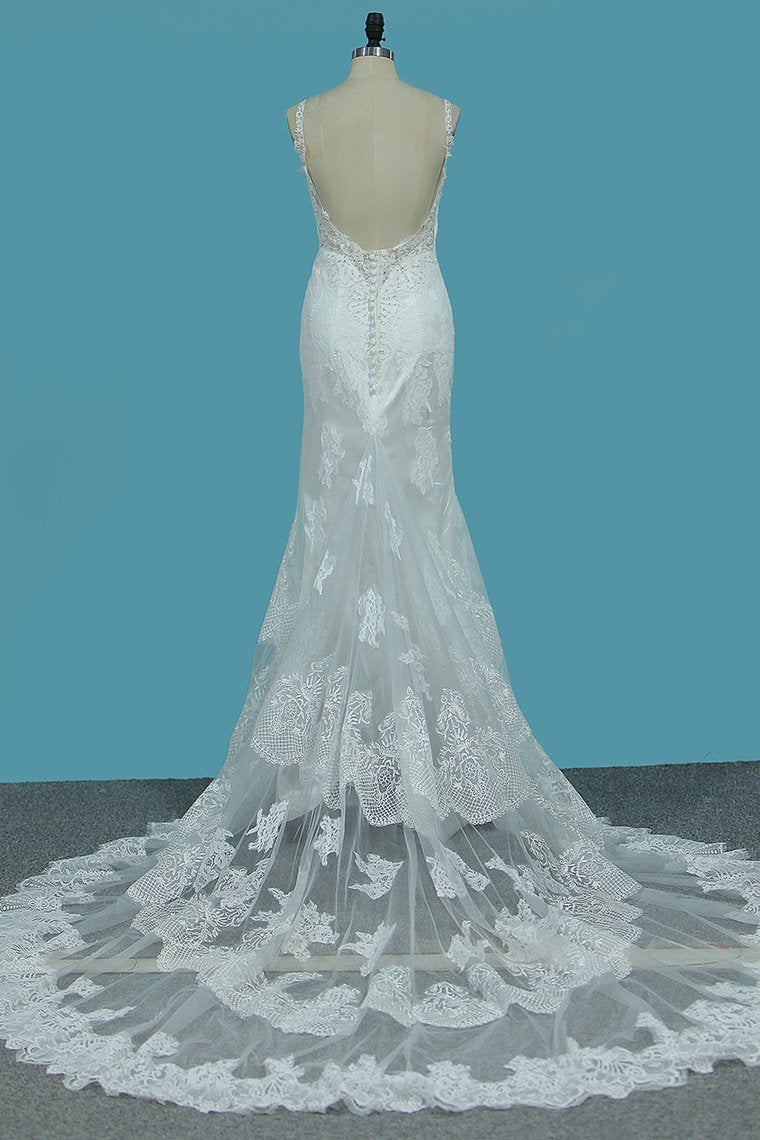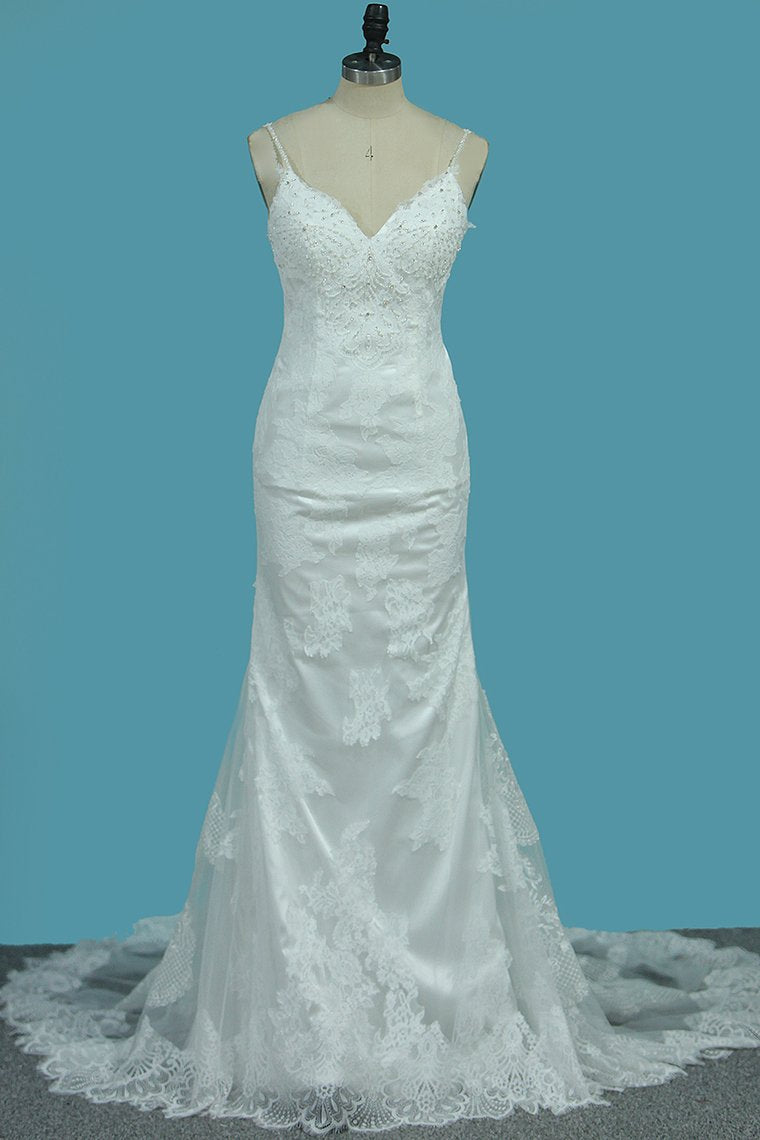 2024 Spaghetti Straps Mermaid Wedding Dresses Tulle With Beads&Appliques Open Back