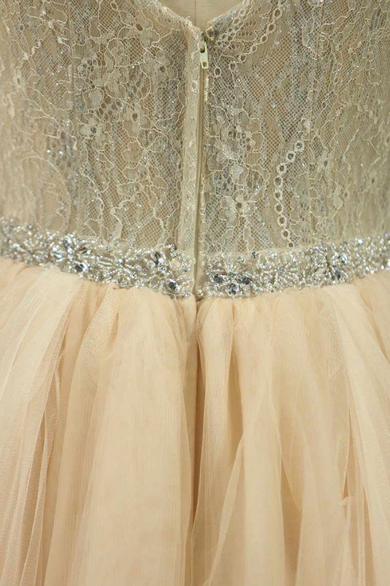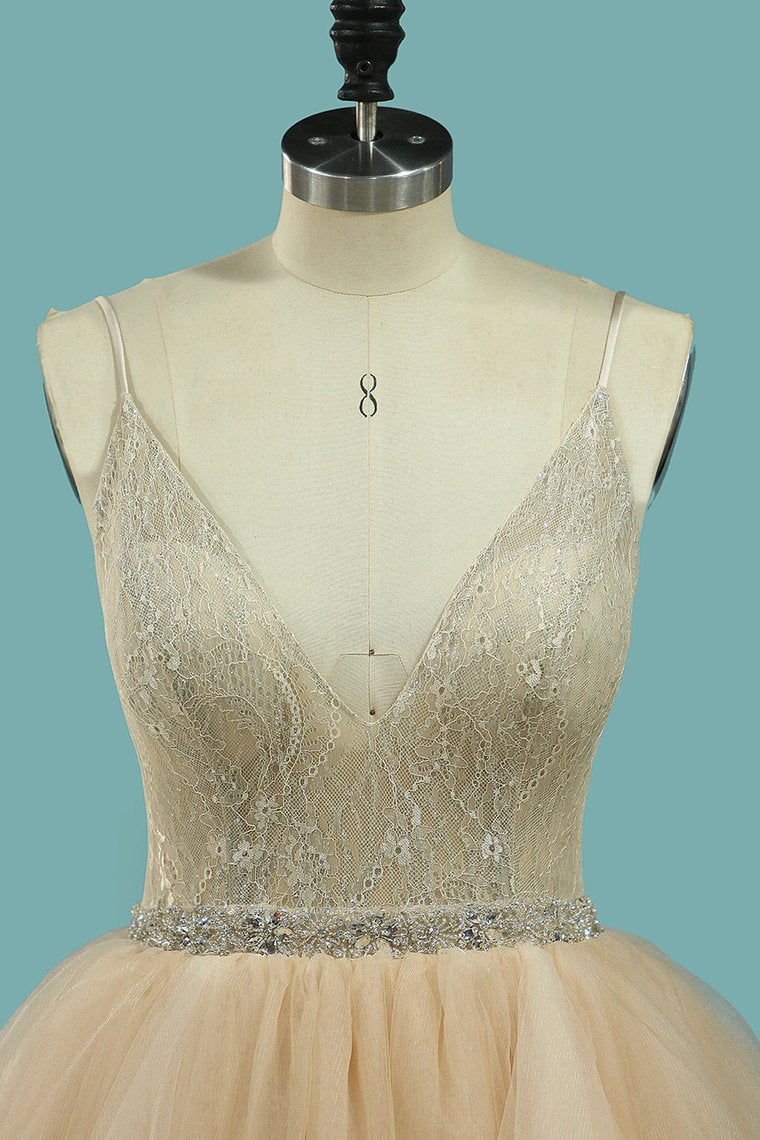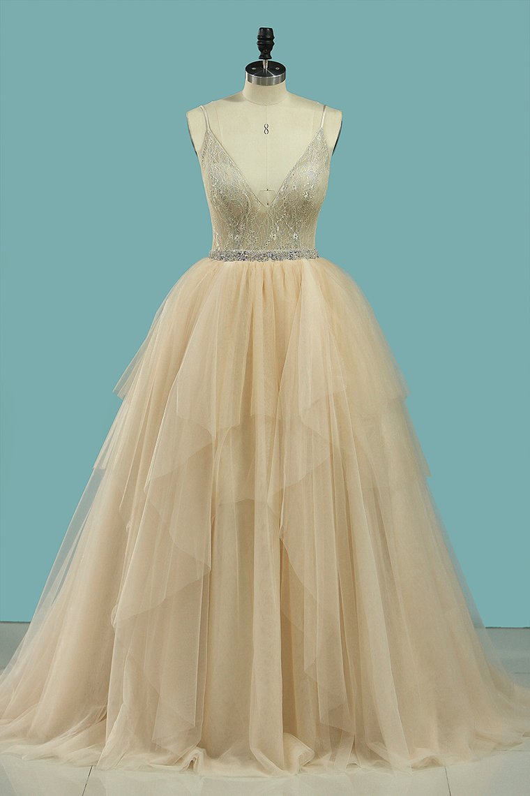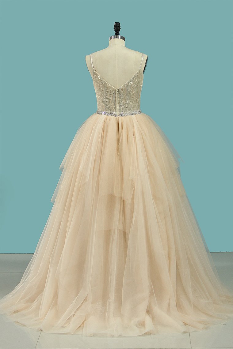 2024 Spaghetti Straps Wedding Dresses A Line Tulle & Lace With Beaded Waistline