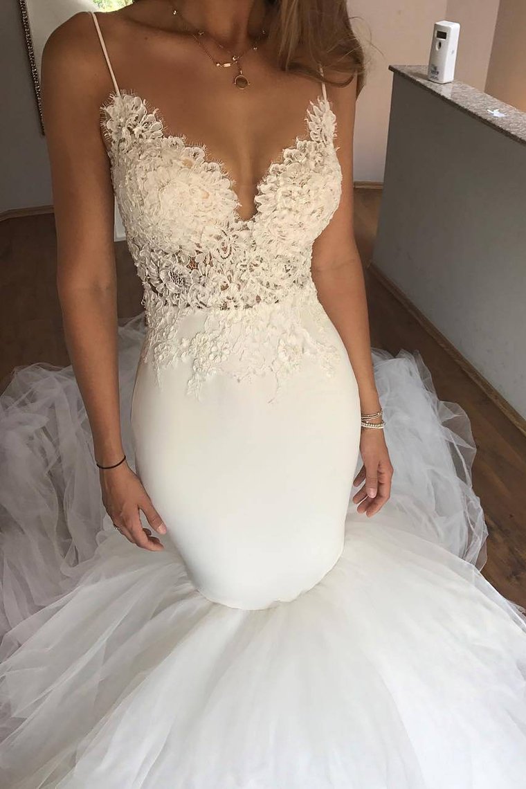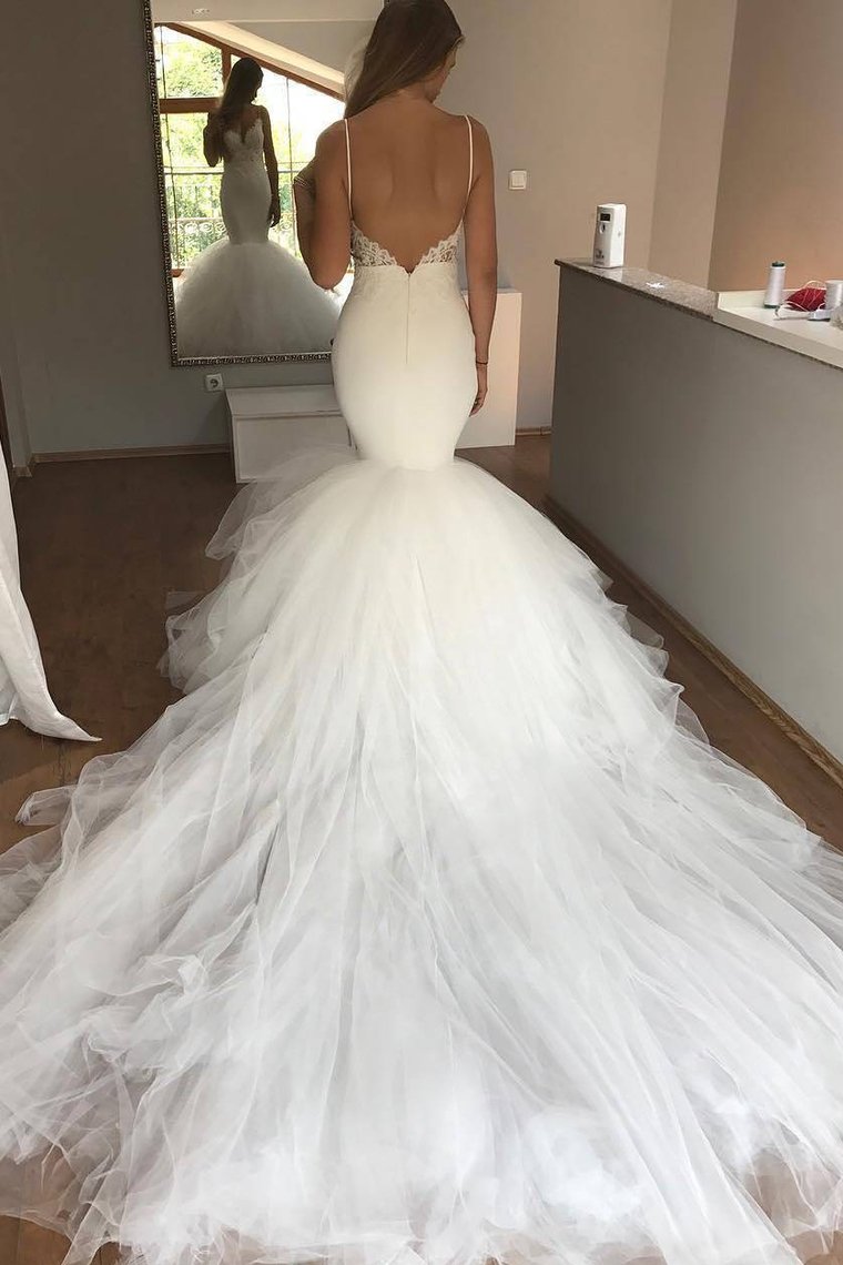 2024 Spaghetti Straps Wedding Dresses Mermaid Tulle With Applique Open Back