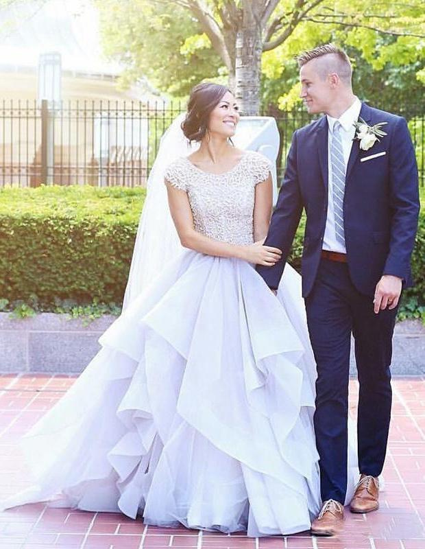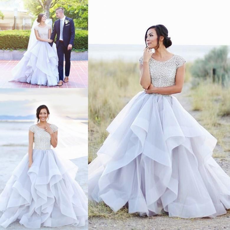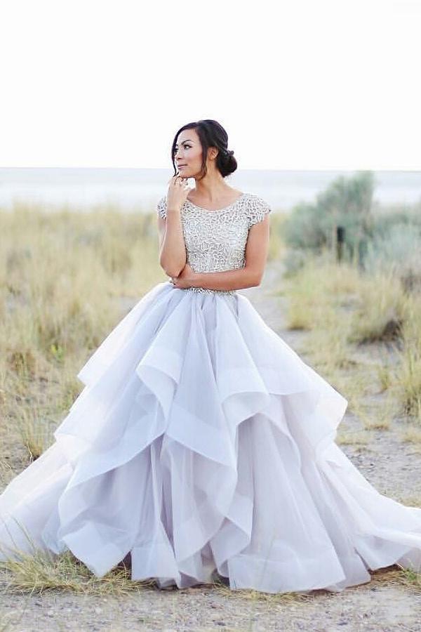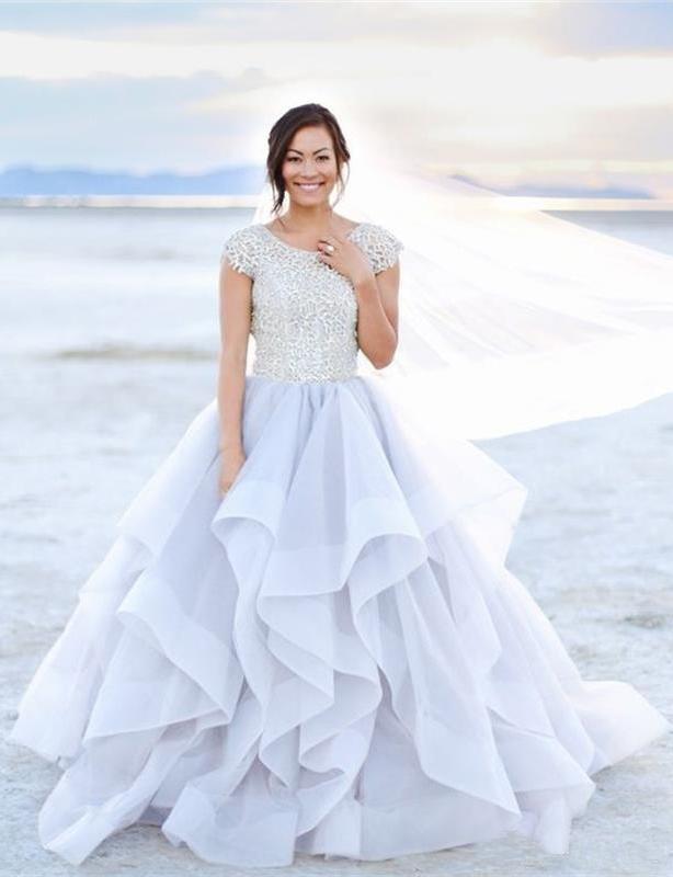 2024 Sparkly Beads Ruffles Organza Scoop Cap Sleeve Lavender Prom Wedding Dresses RS143