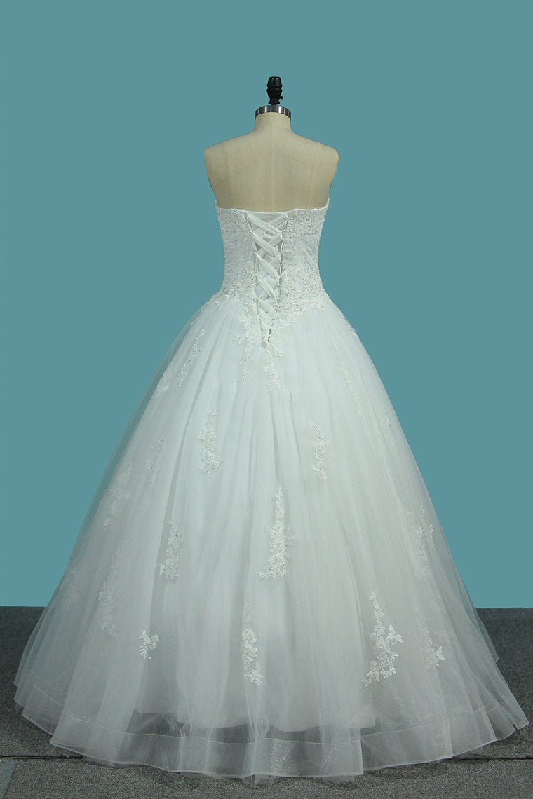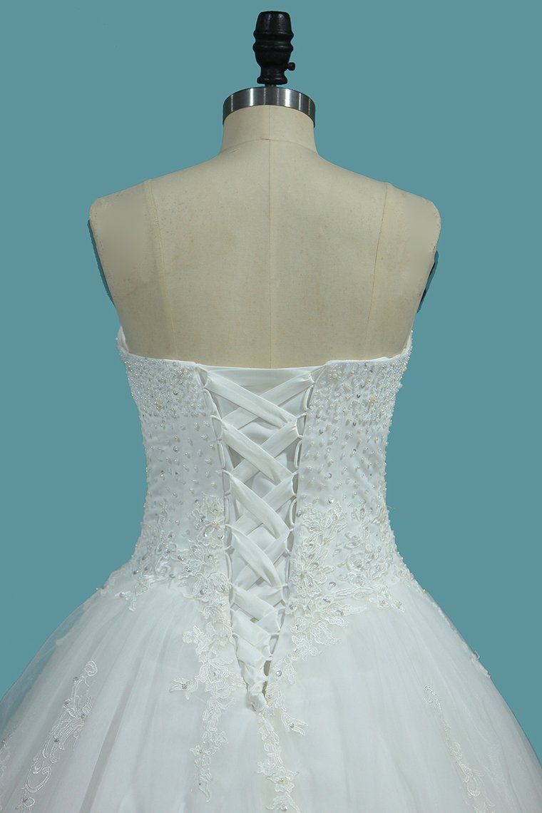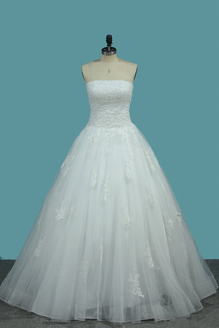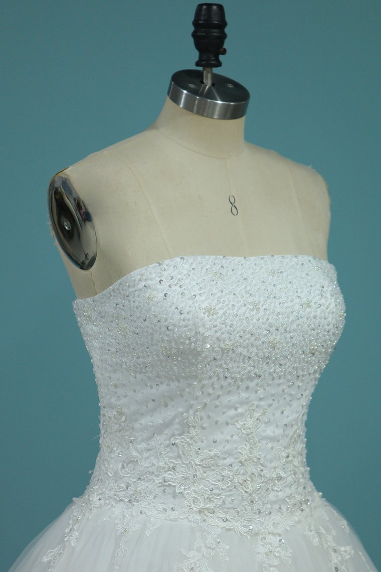 2024 Strapless Ball Gown Tulle Wedding Dresses With Beads And Applique