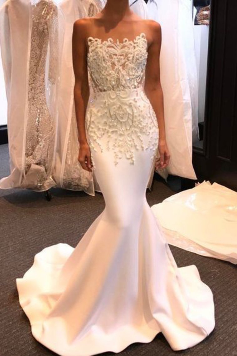 2024 Strapless Satin With Applique And Beads Wedding Dresses Mermaid