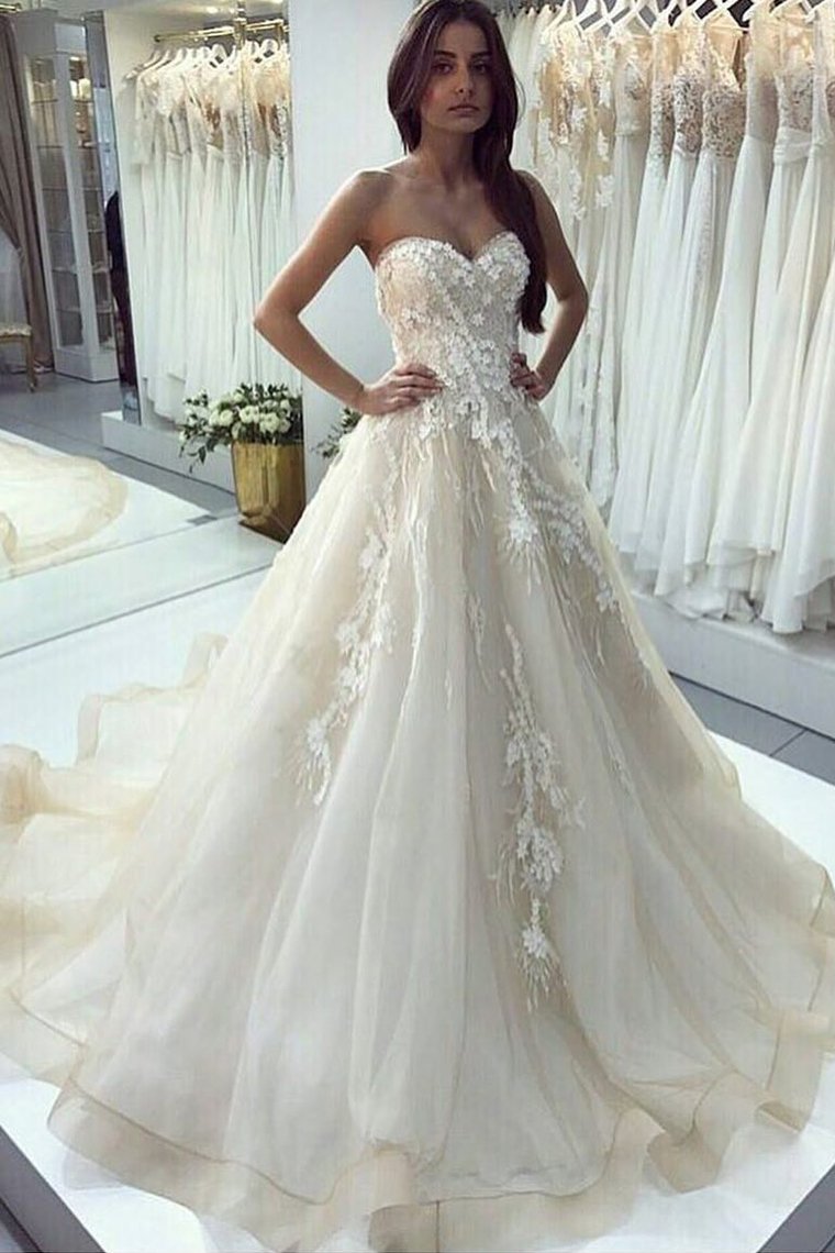 2024 Sweetheart A Line Wedding Dresses Tulle With Applique Sweep Train