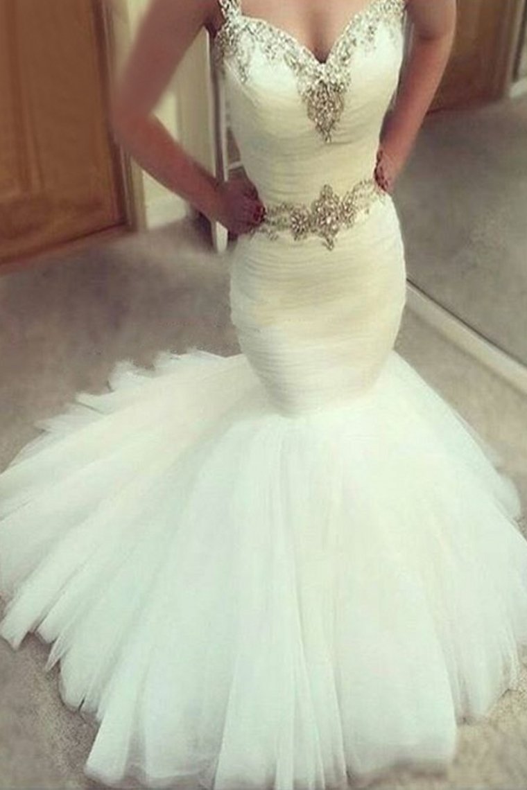 2024 Sweetheart Mermaid Wedding Dresses Straps Beaded Belt Ruffles Tulle