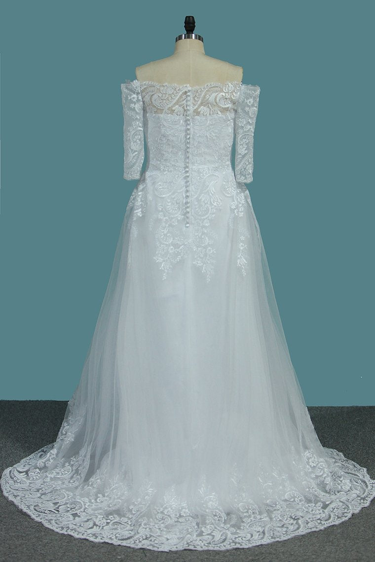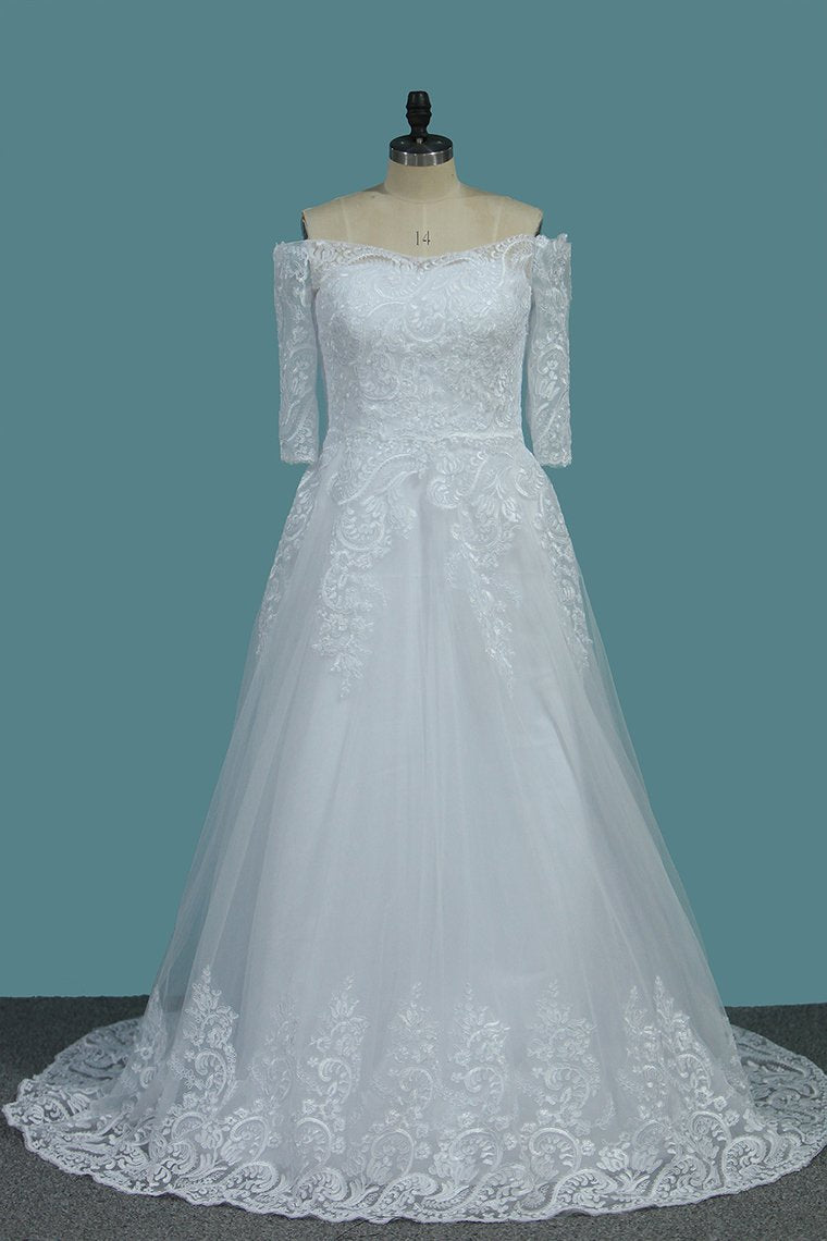 2024 Tulle A Line Boat Neck 3/4 Length Sleeves Wedding Dresses With Applique