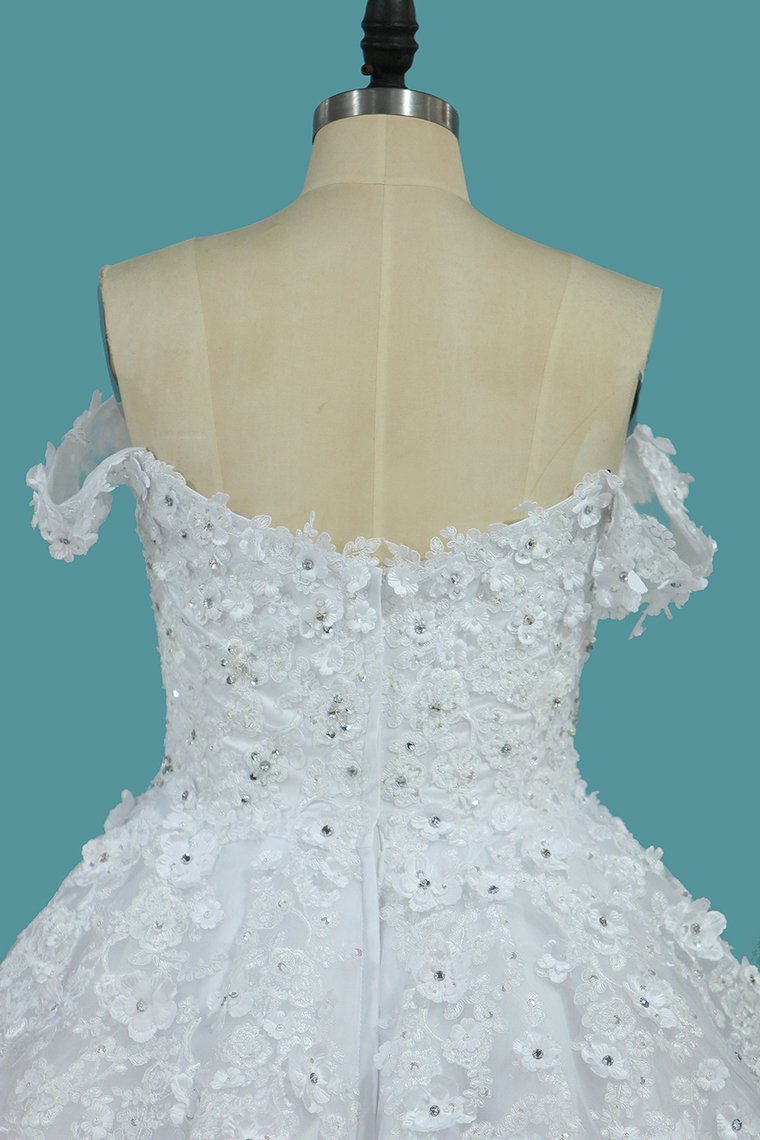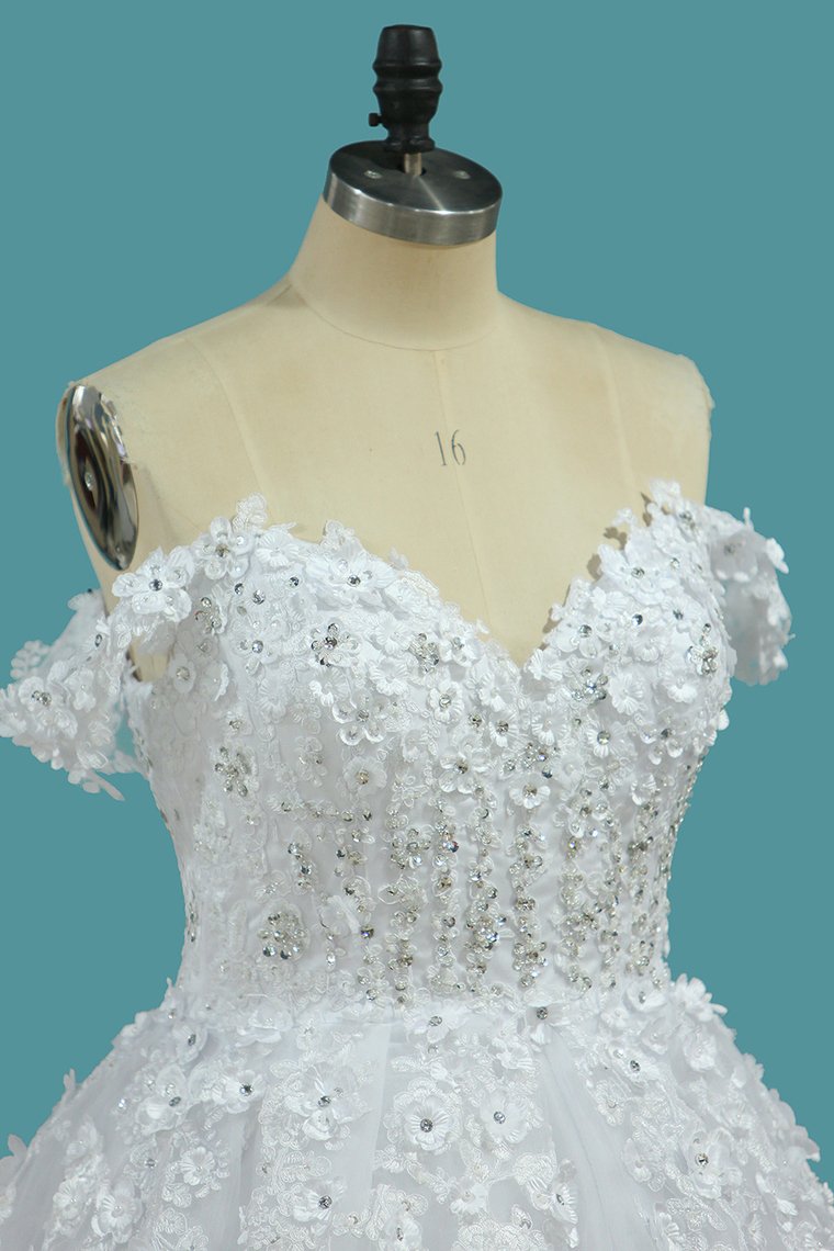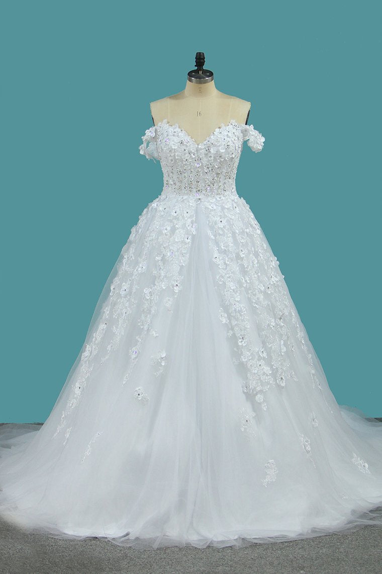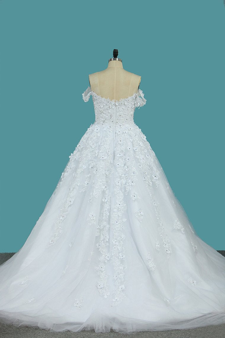 2024 Tulle A Line Off The Shoulder With Applique And Beads Court Train Wedding Dresses