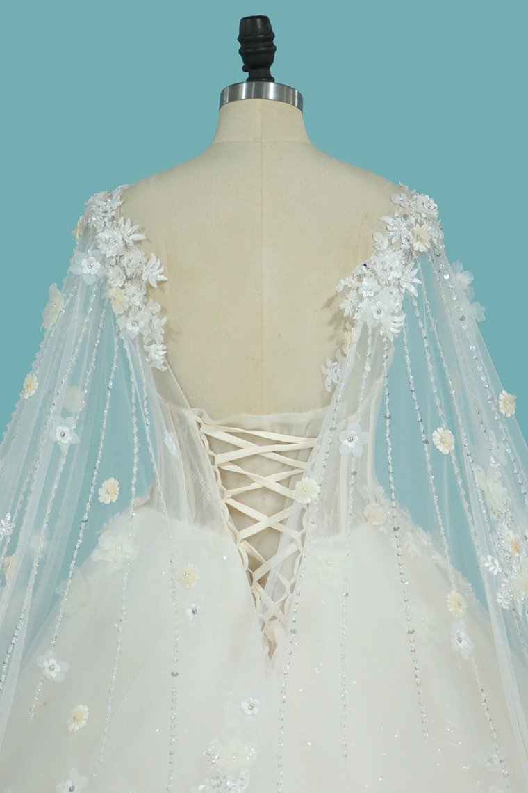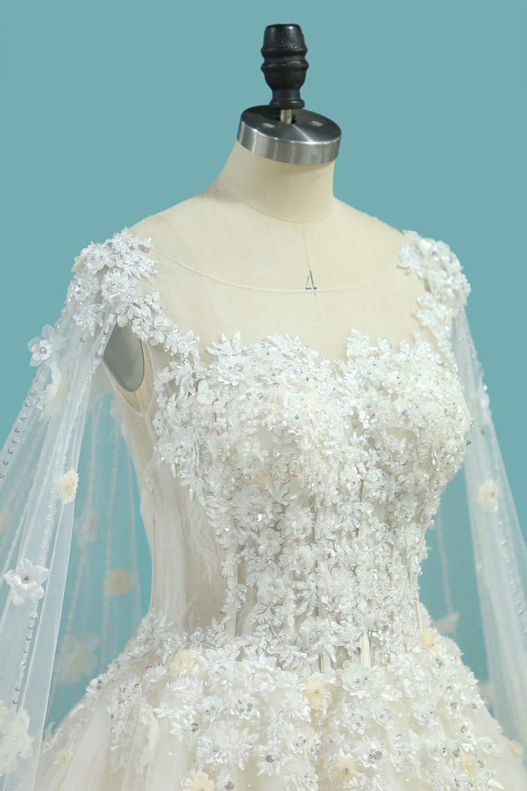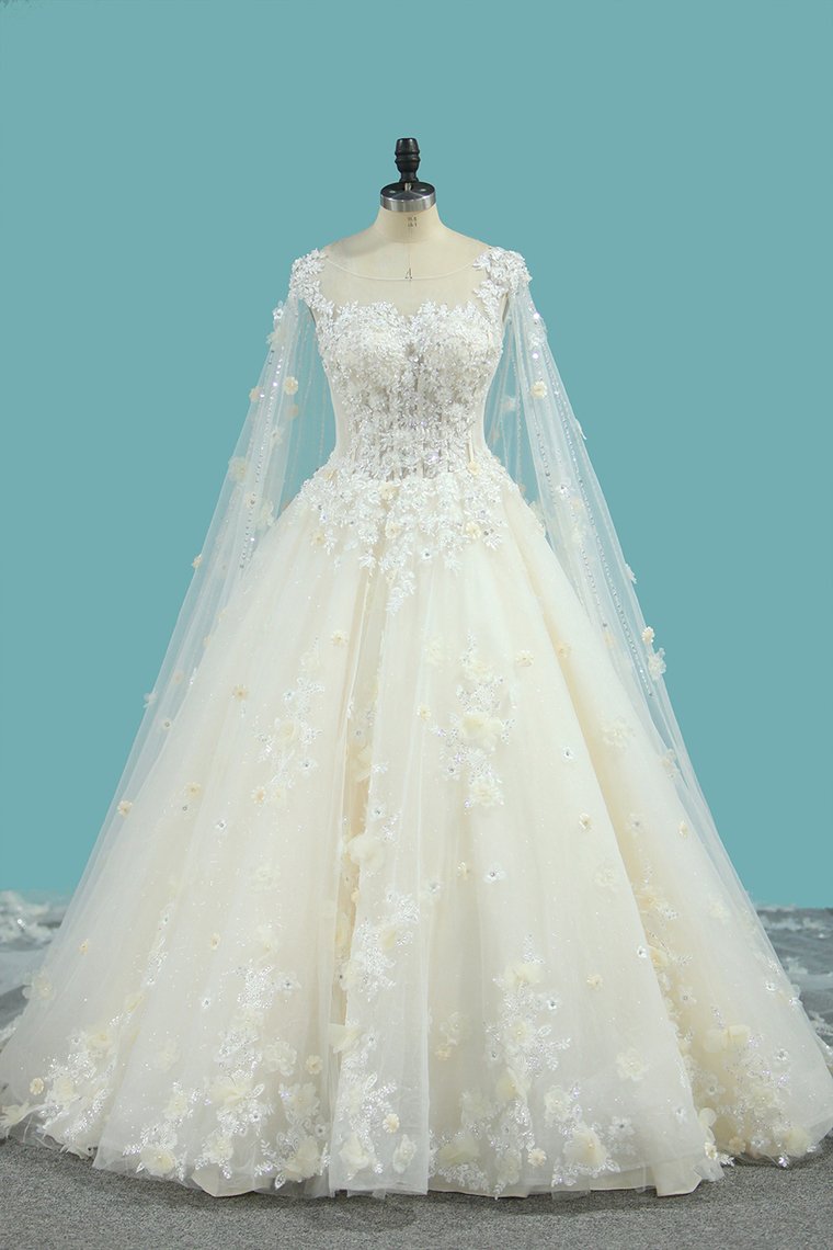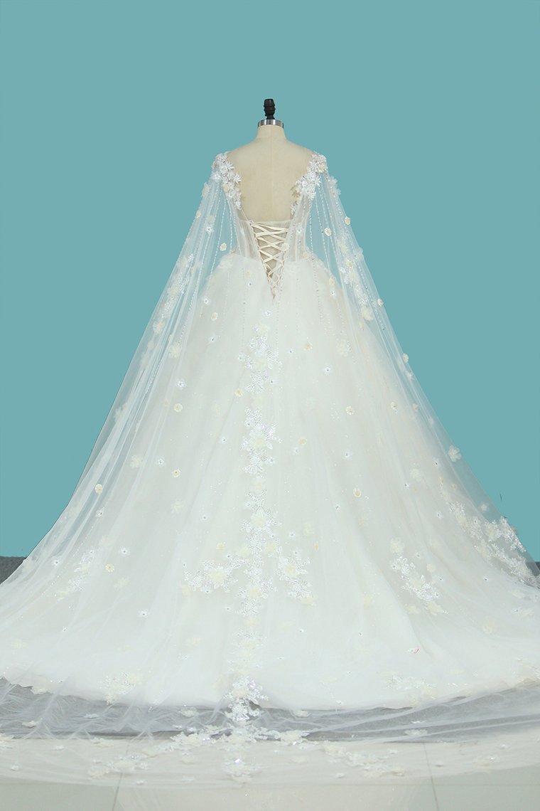 2024 Tulle A Line Scoop Wedding Dresses With Beading Chapel Train Lace Up