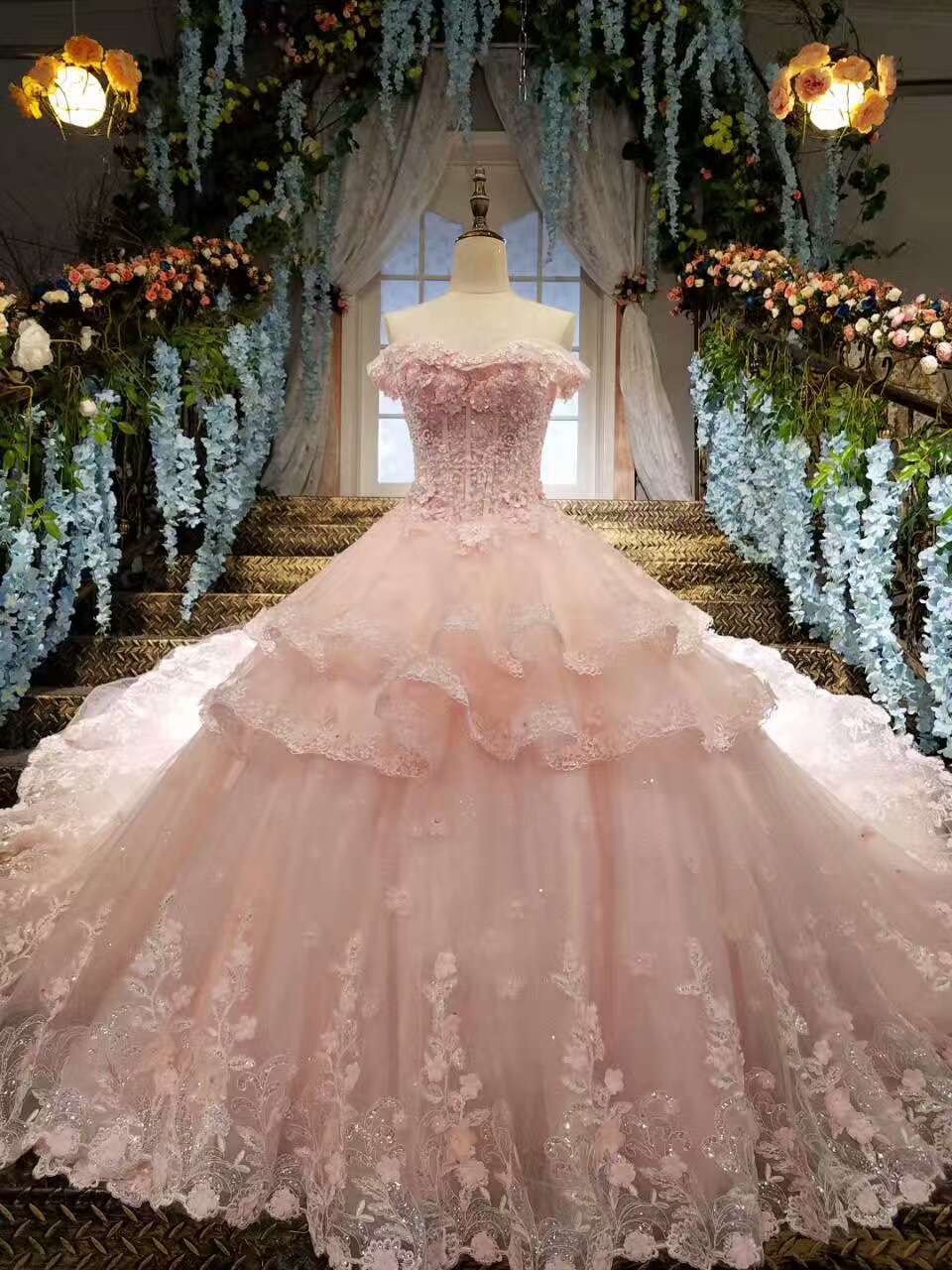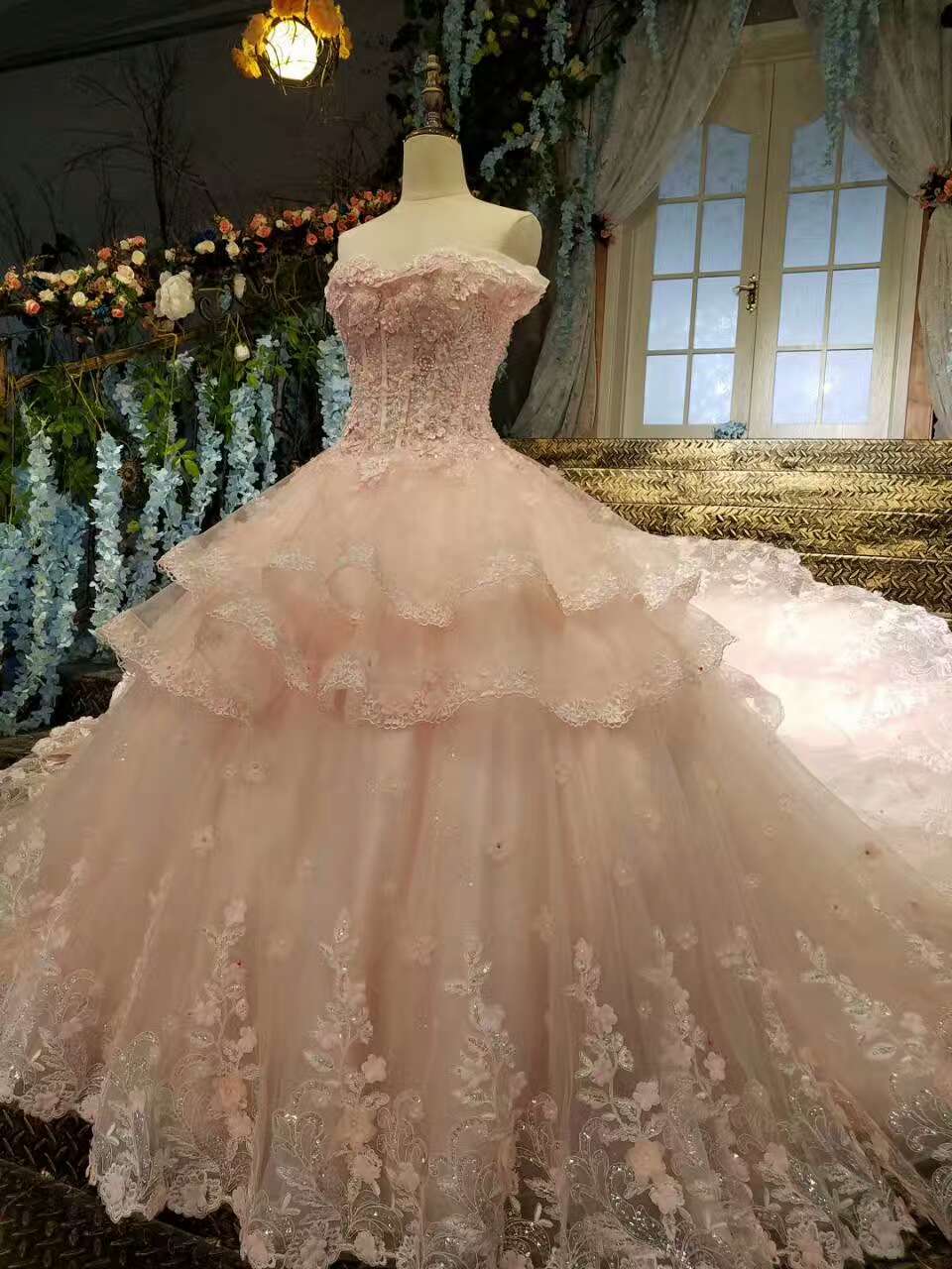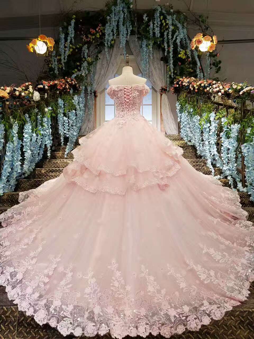2024 Tulle Awesome Pink Wedding Dresses Off The Shoulder Lace Up With Appliques And Crystals