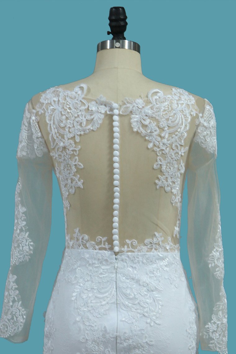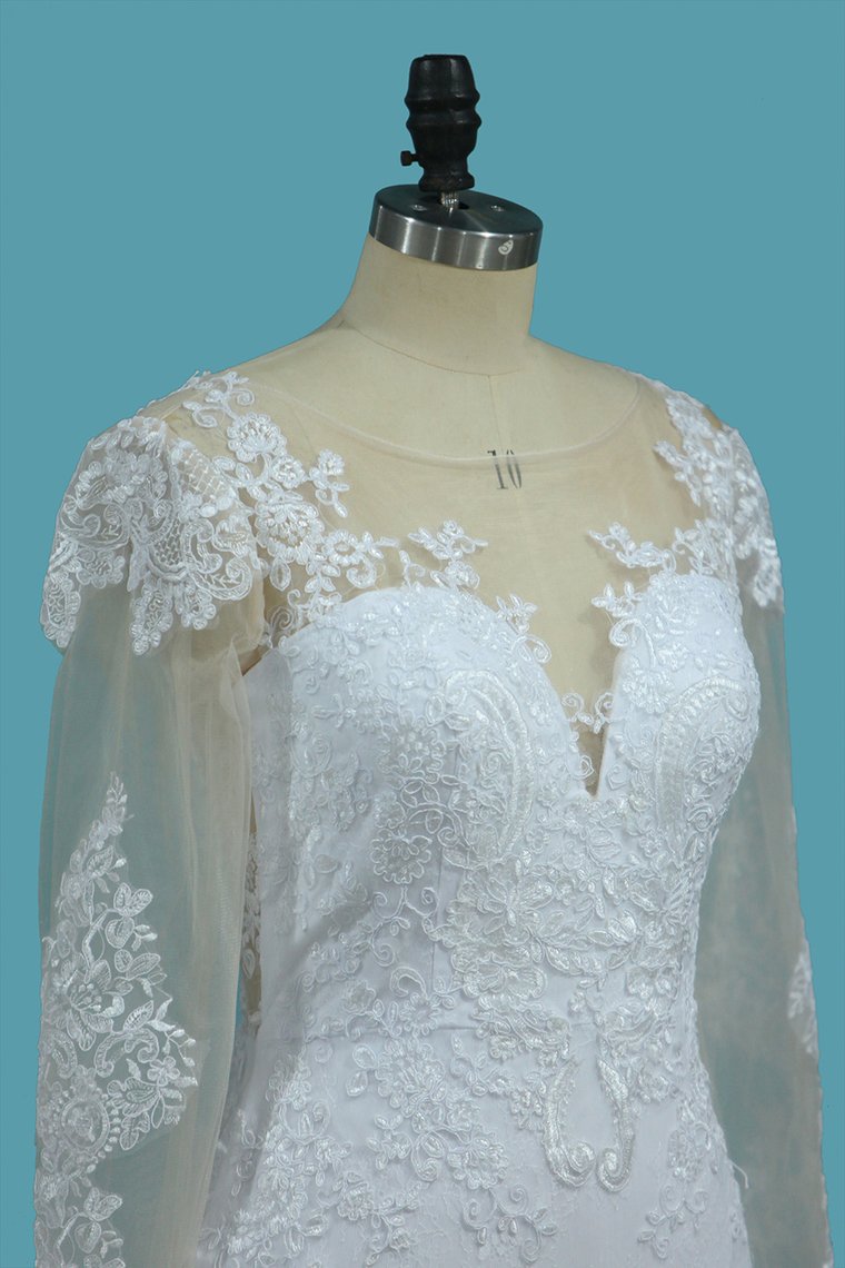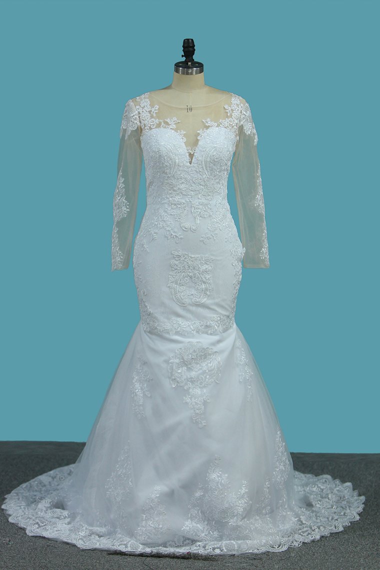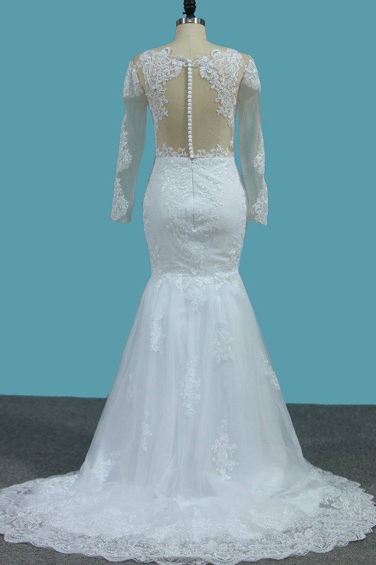 2024 Tulle Long Sleeves Mermaid With Applique Chapel Train Wedding Dresses