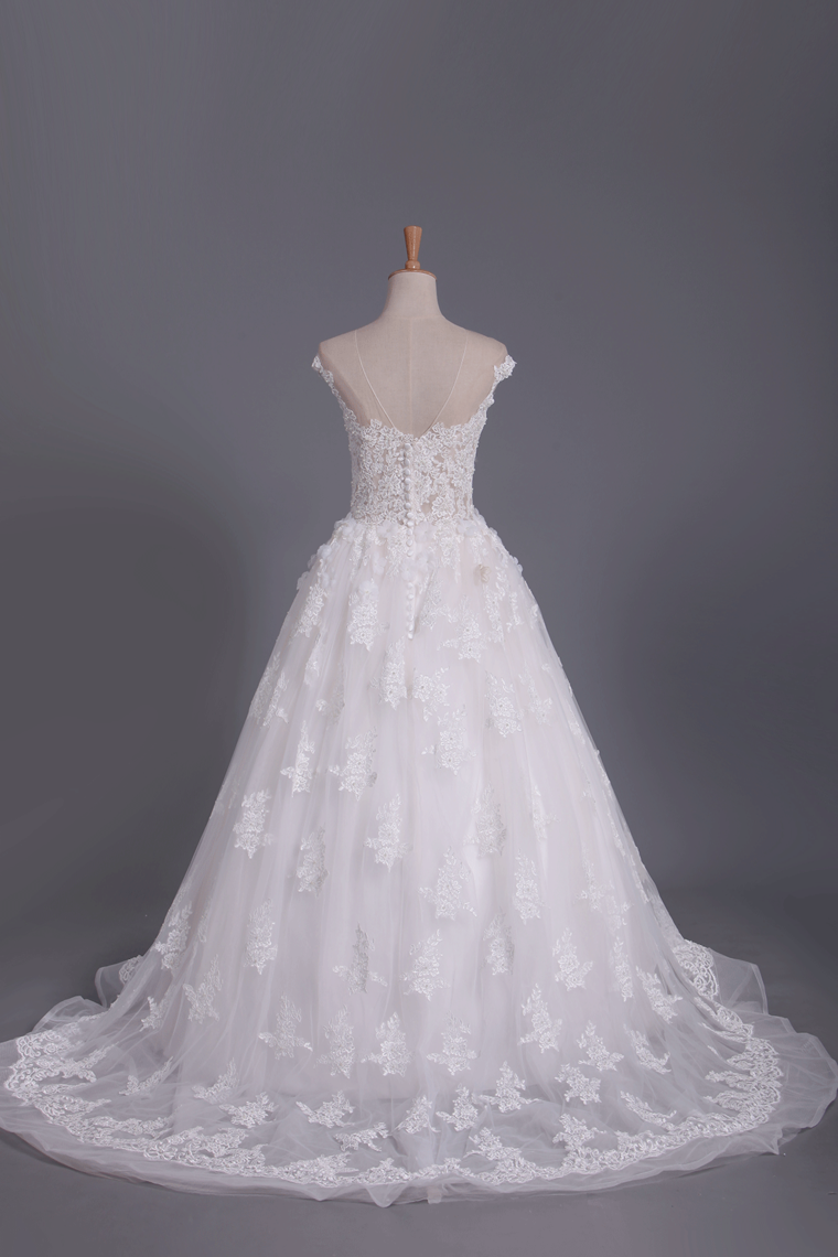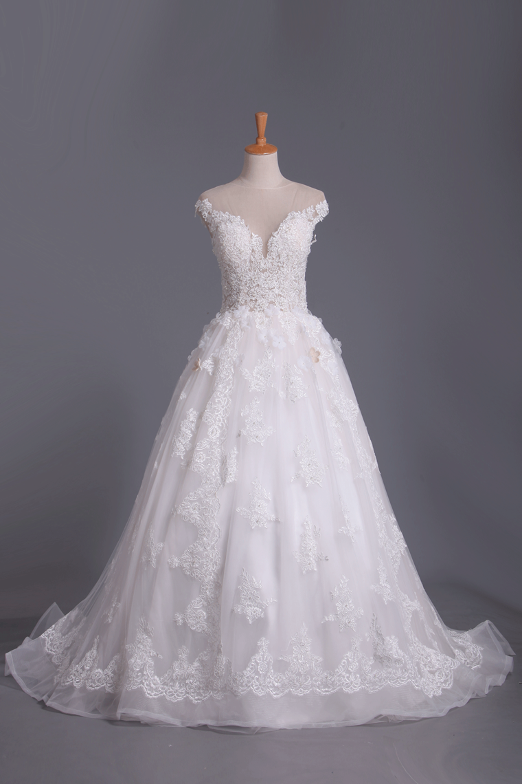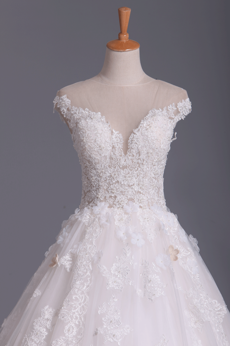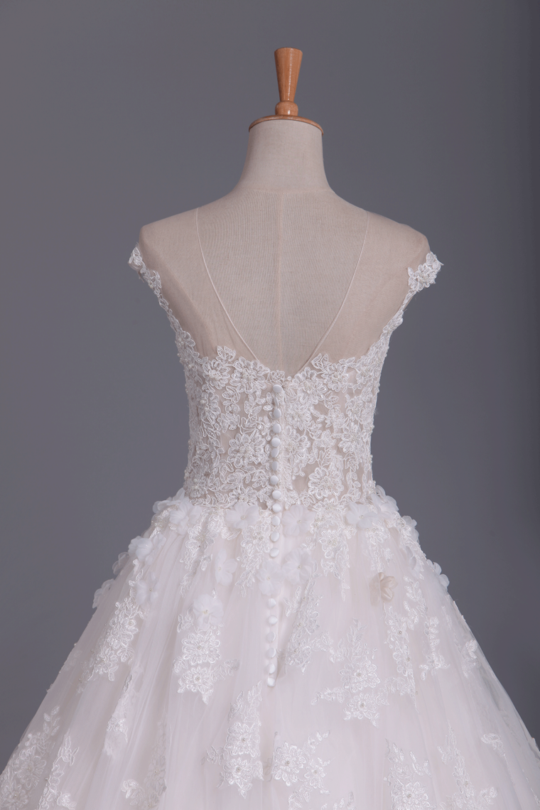 2024 Tulle Scoop Short Sleeves Wedding Dresses A Line With Applique