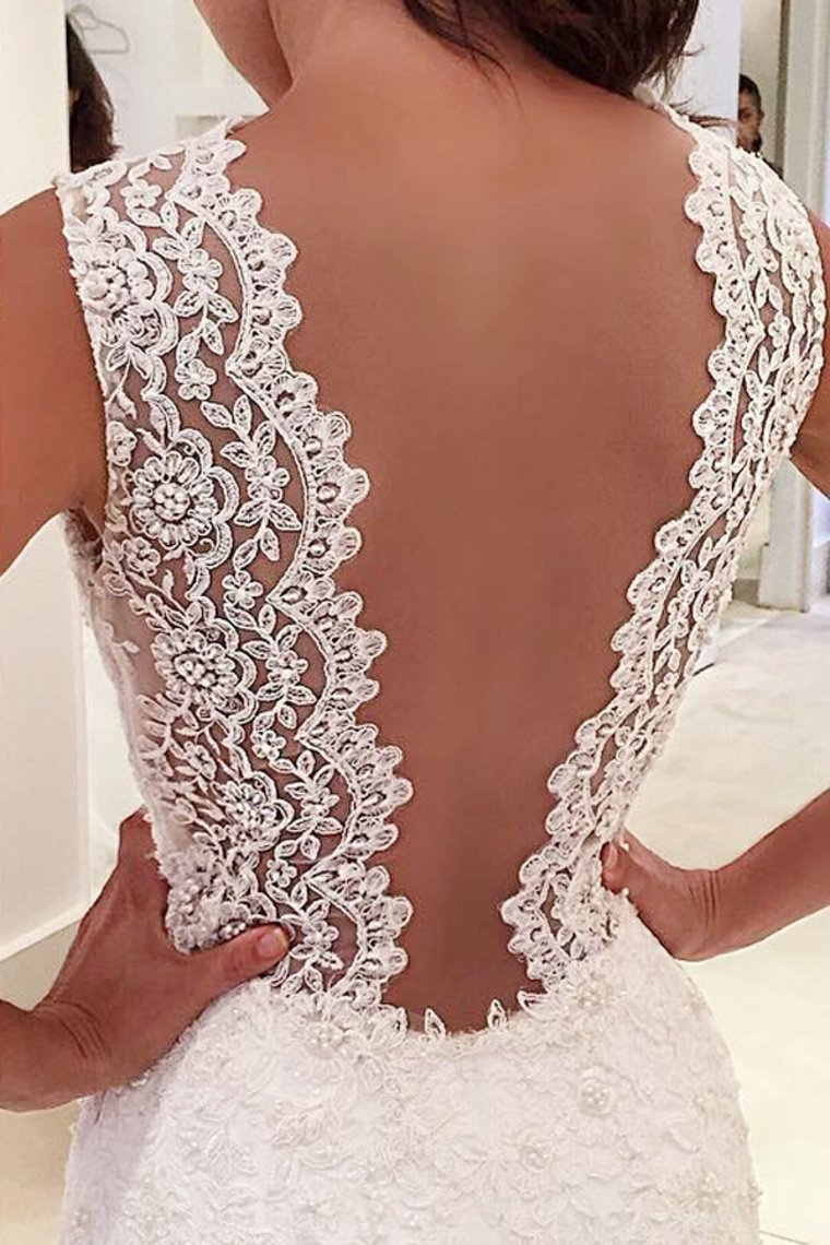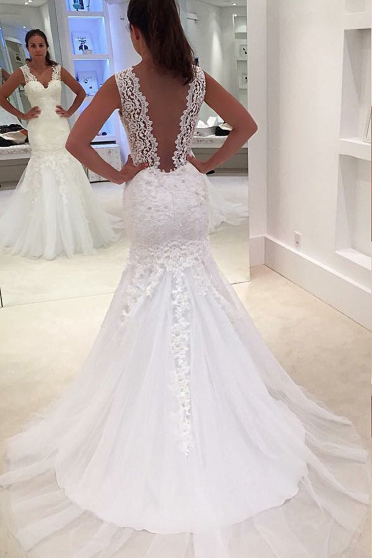 2024 Tulle Wedding Dresses Mermaid V Neck With Applique Court Train