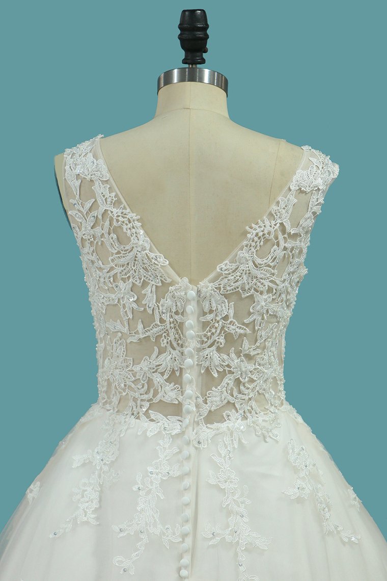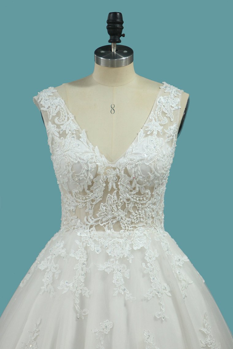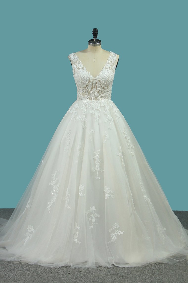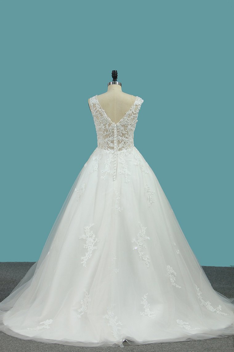 2024 Tulle Wedding Dresses V Neck A Line With Applique Court Train