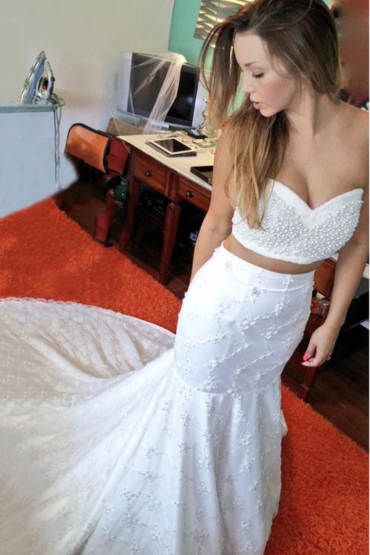 2024 Two-Piece Lace Mermaid Wedding Dresses With Pearls Court Train