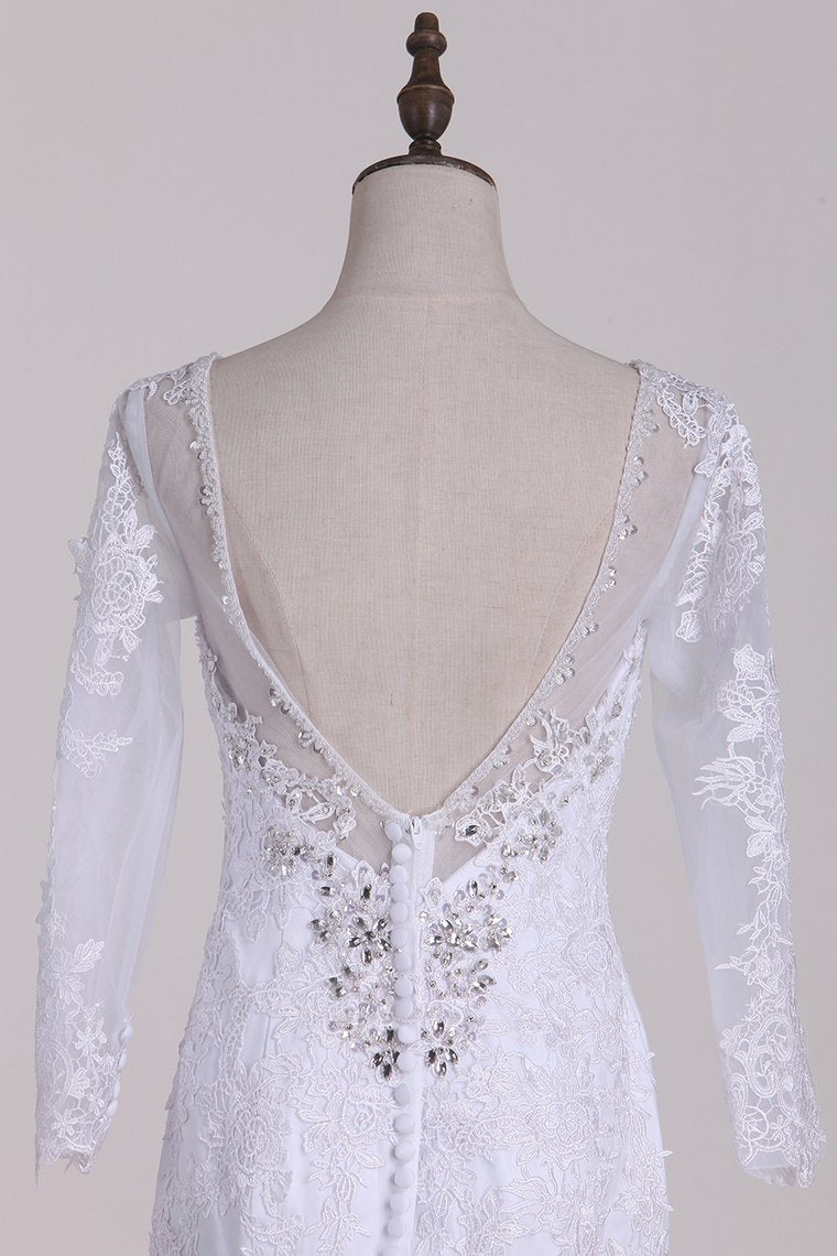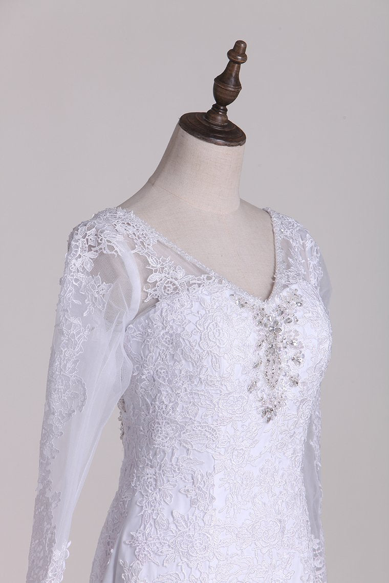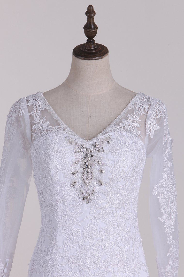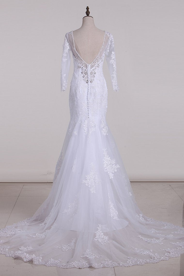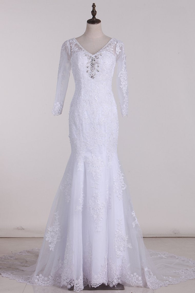2024 V-Neck 3/4 Length Sleeve Wedding Dresses Mermaid Tulle With Beads And Applique Court Train