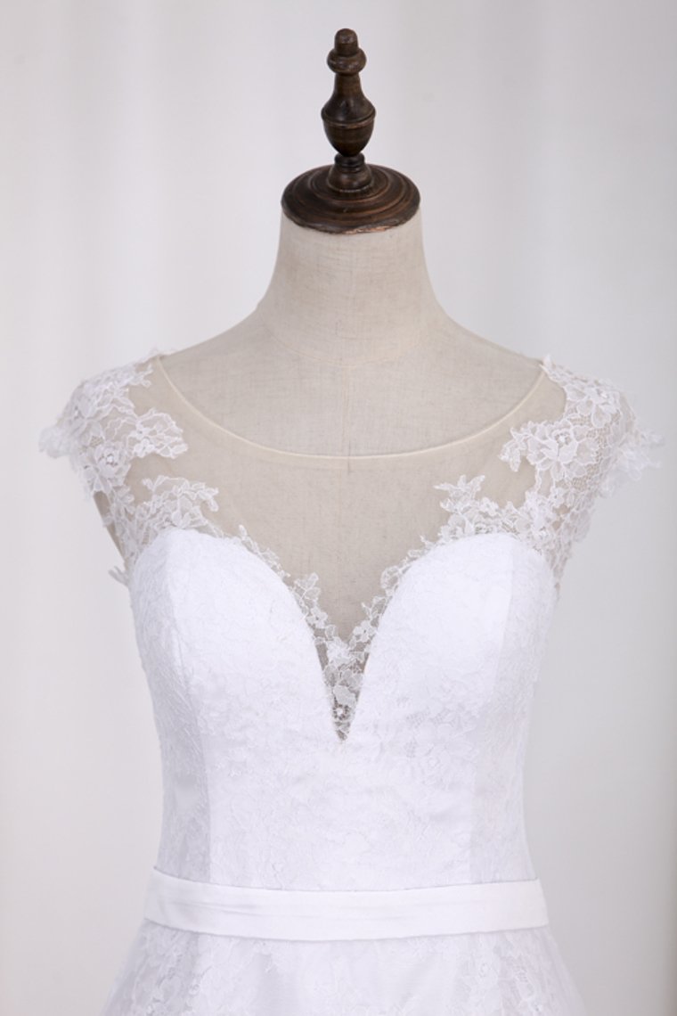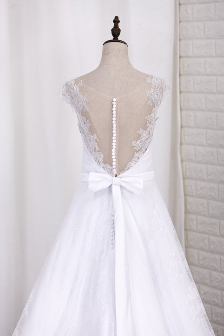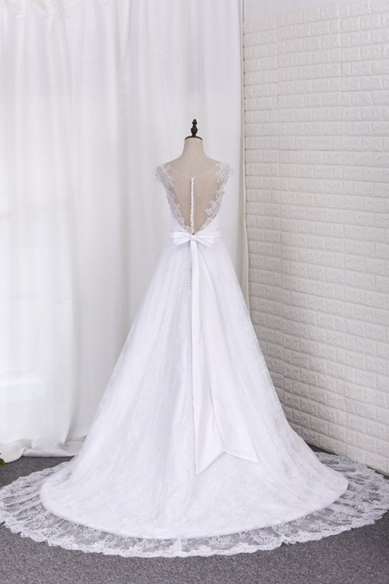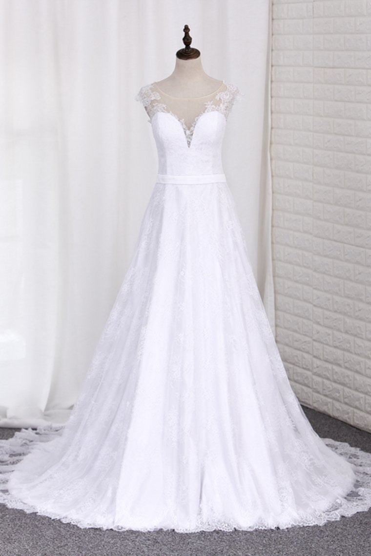 2024 V Neck A Line Wedding Dresses Lace With Sash Court Train