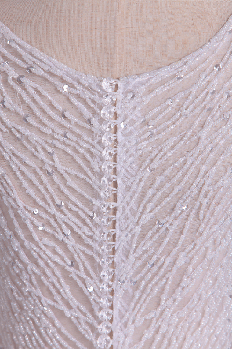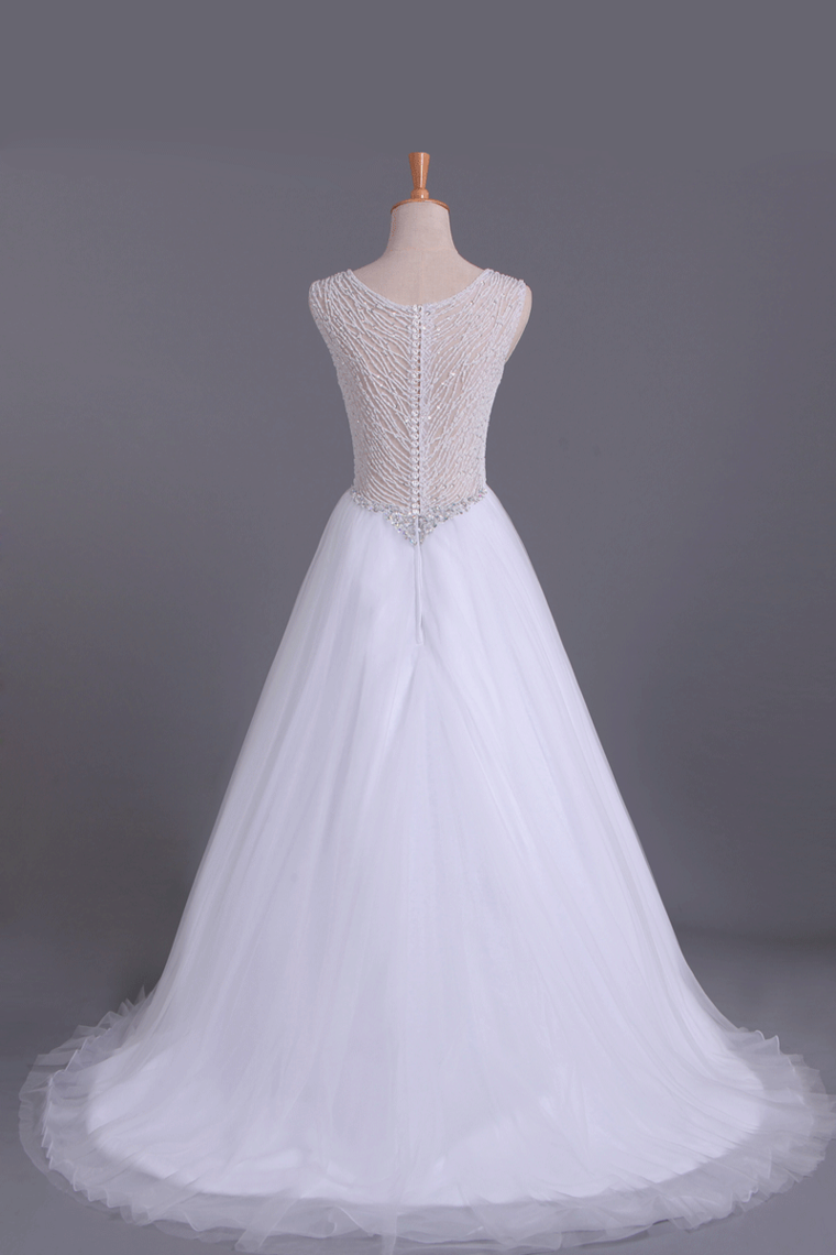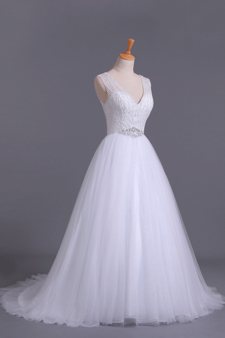 2024 V-Neck A Line Wedding Dresses Tulle Beaded Bodice Court Train