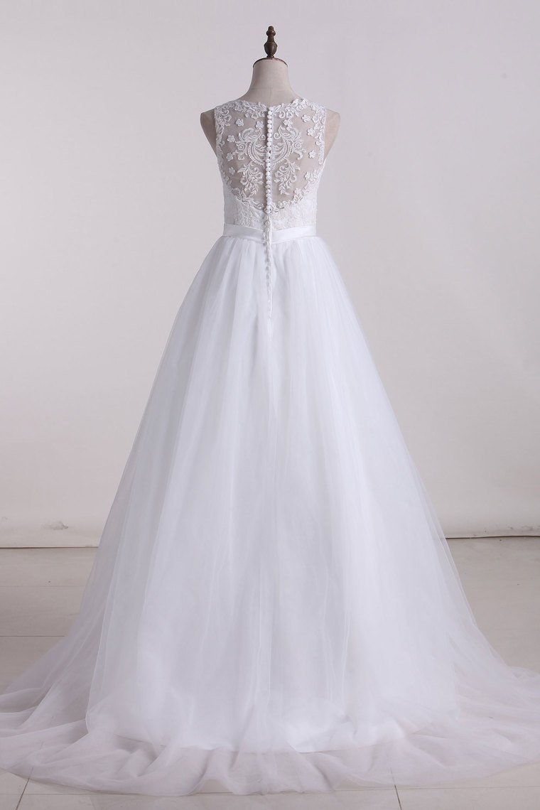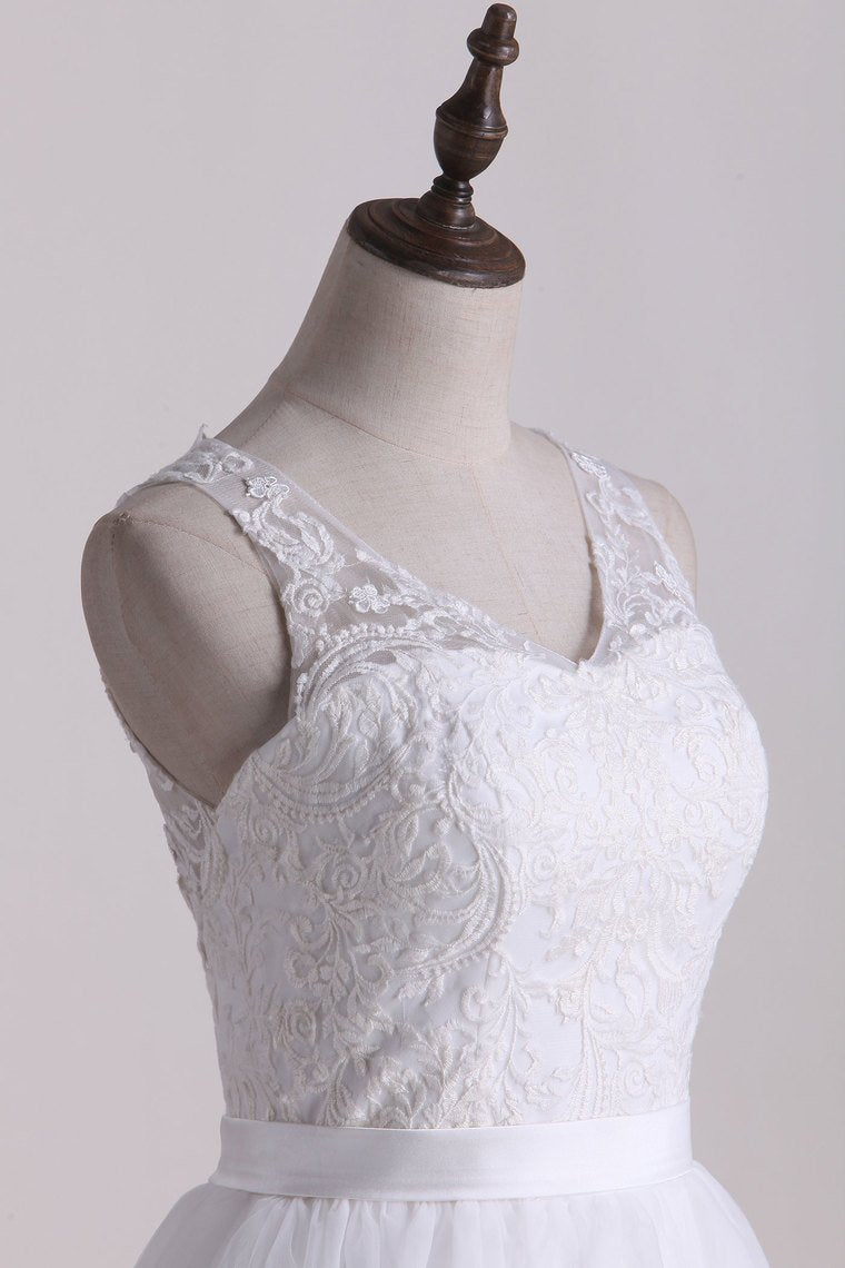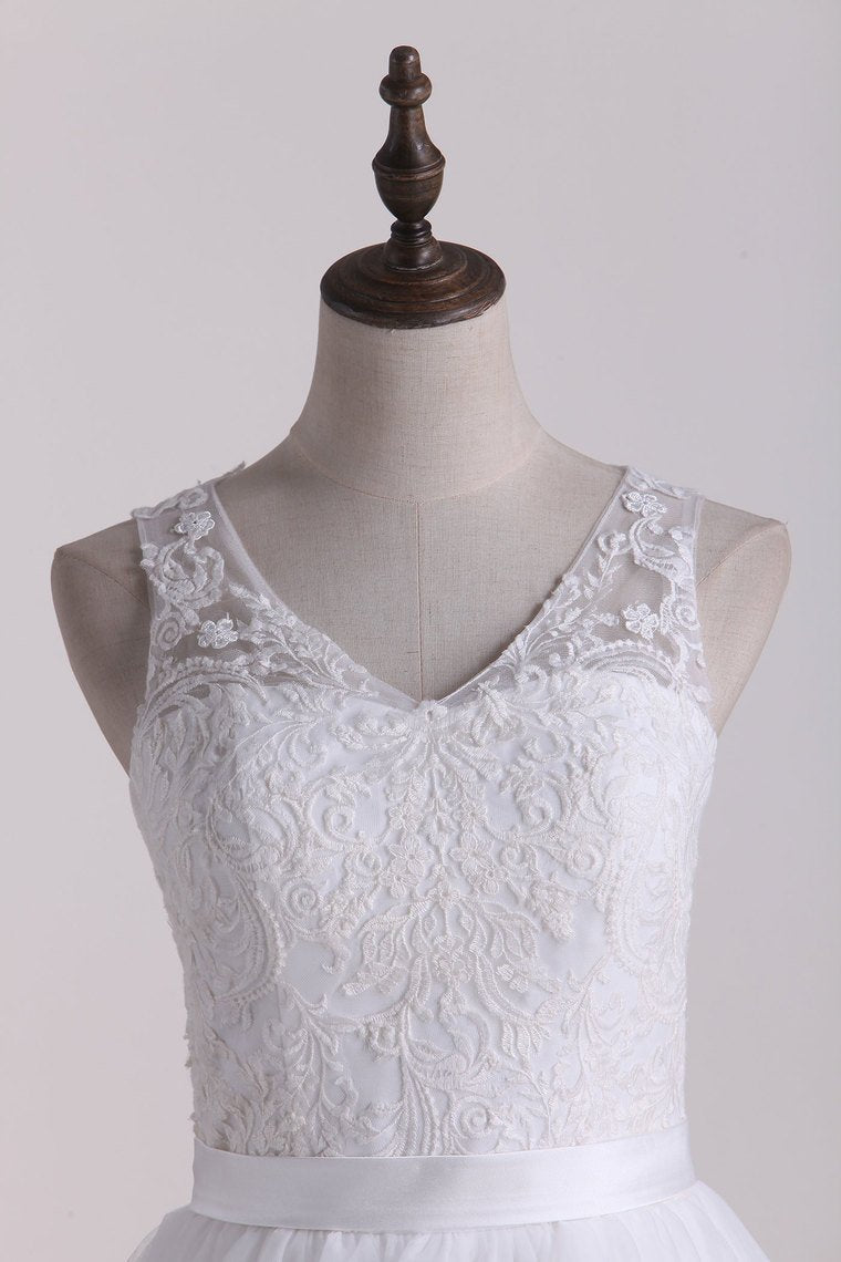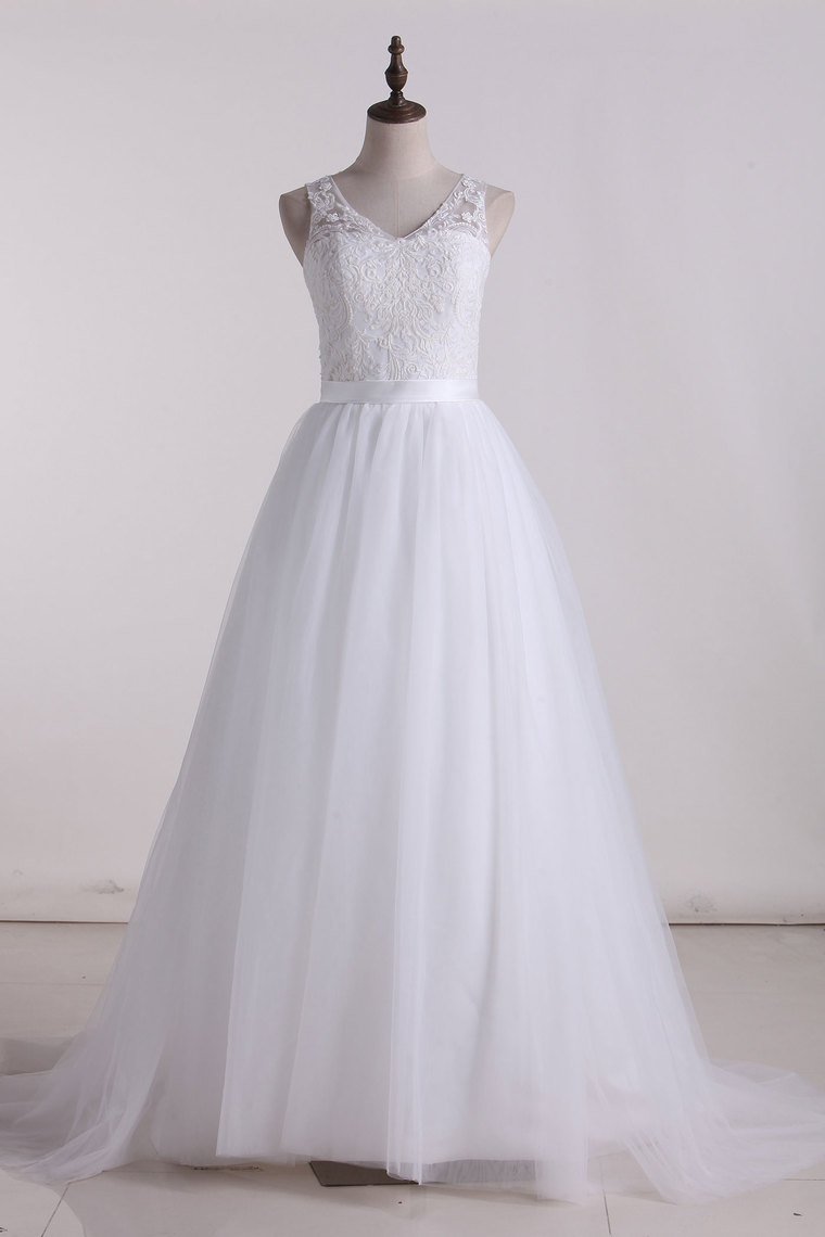 2024 V-Neck A Line Wedding Dresses Tulle With Applique And Ribbon