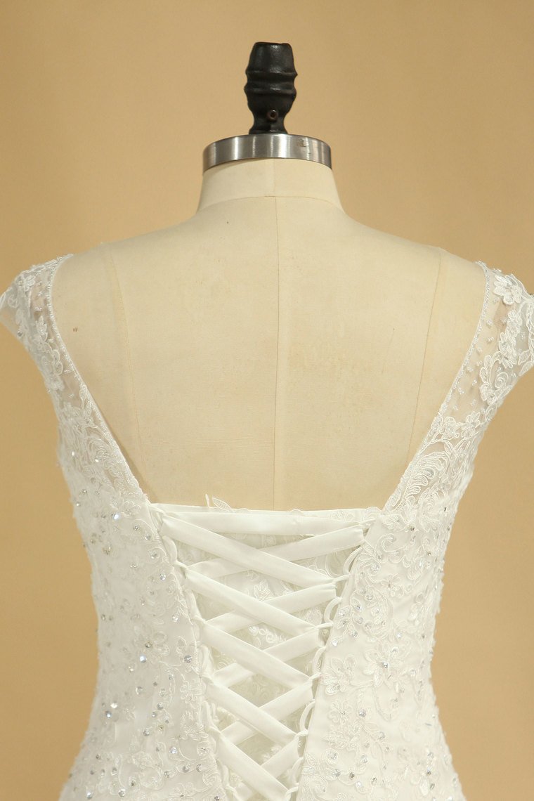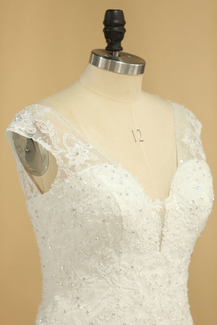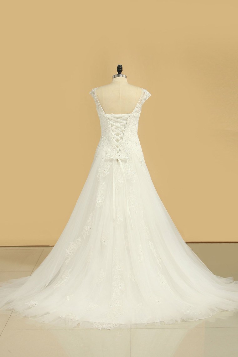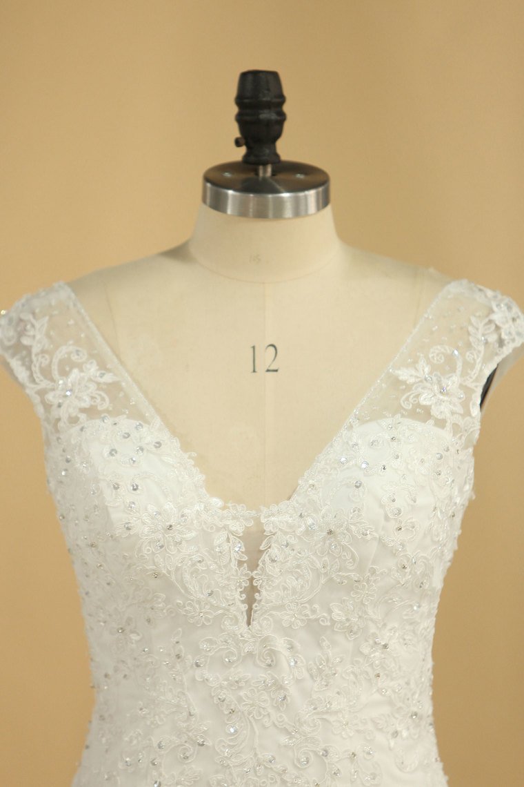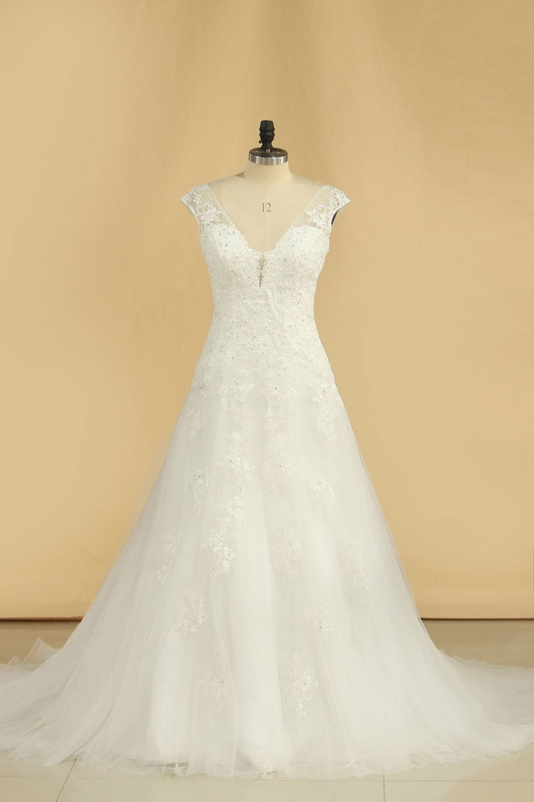 2024 V Neck A Line Wedding Dresses Tulle With Applique Court Train