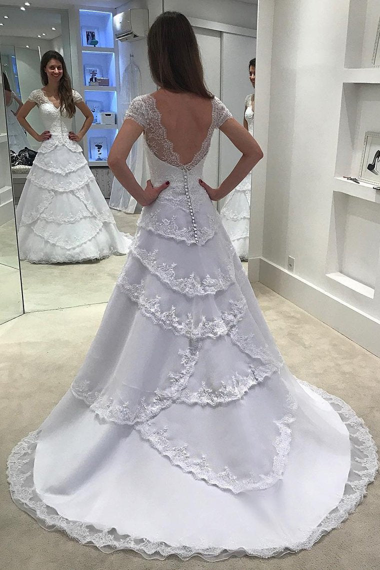 2024 V Neck Short Sleeves A Line Wedding Dresses Tulle With Applique Sweep Train