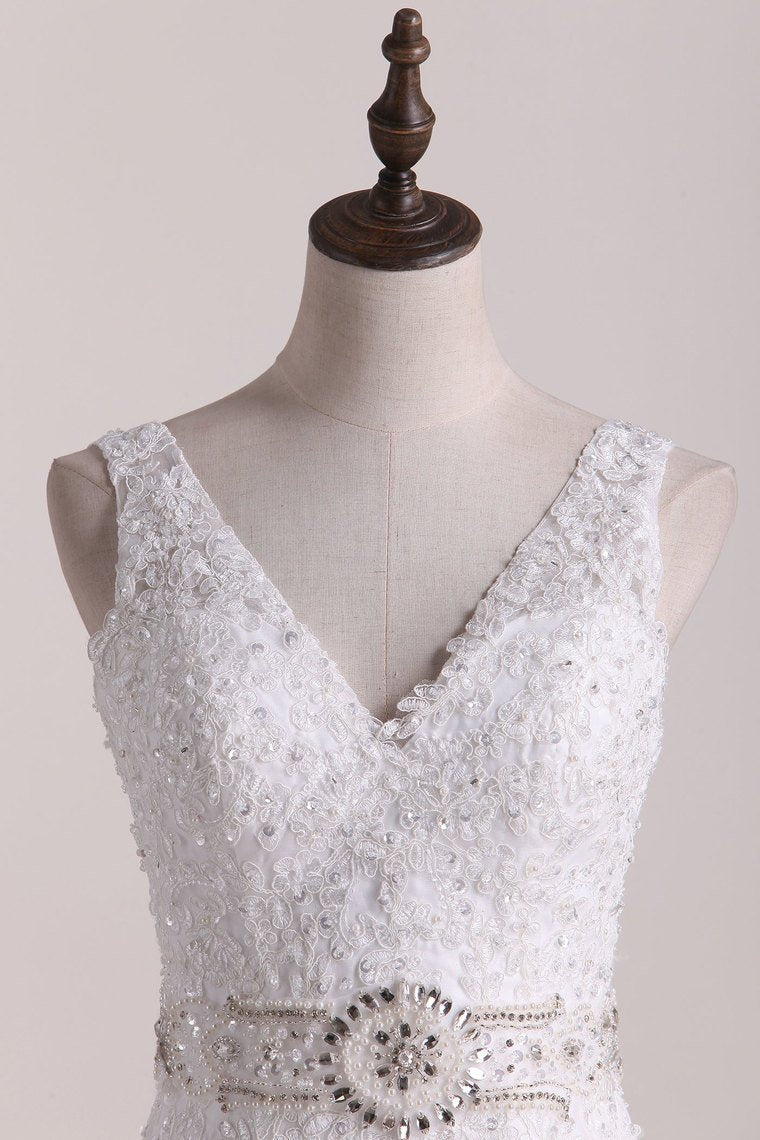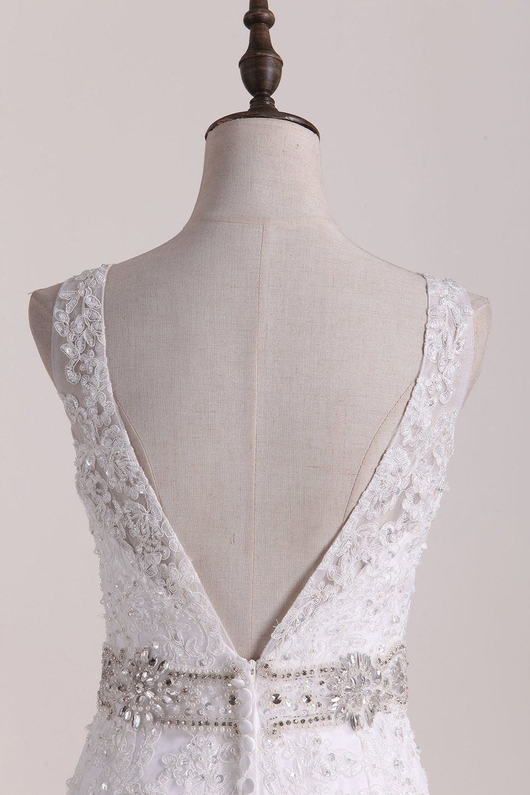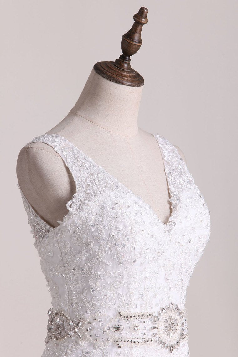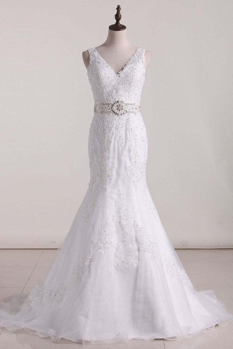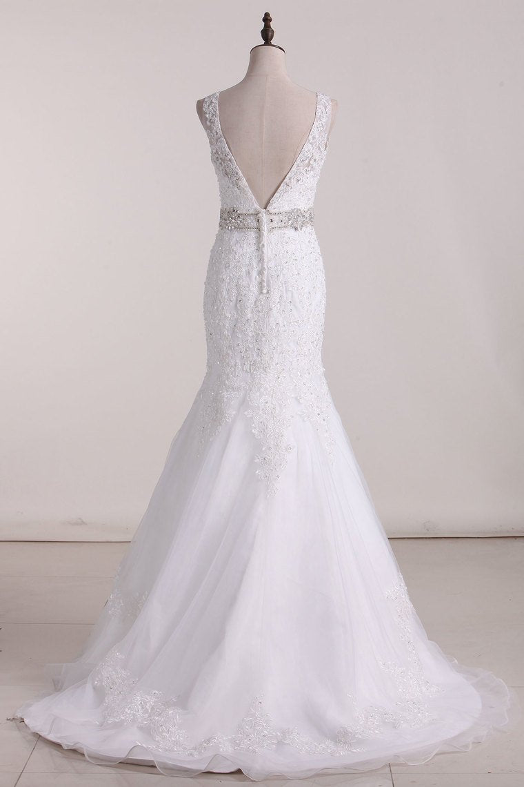 2024 V-Neck Wedding Dresses Mermaid/Trumpet Tulle With Embroidery And Beads Court Train
