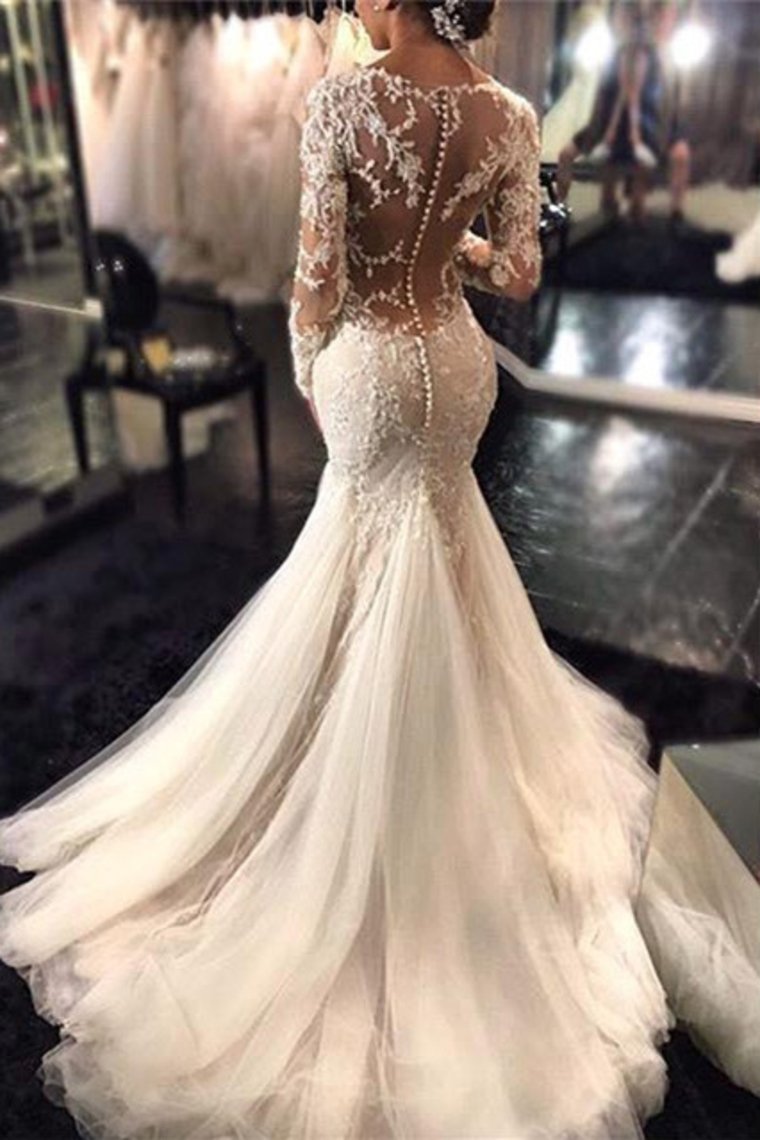 2024 V Neck Wedding Dresses Mermaid/Trumpet With Applique And Beads Sweep Train