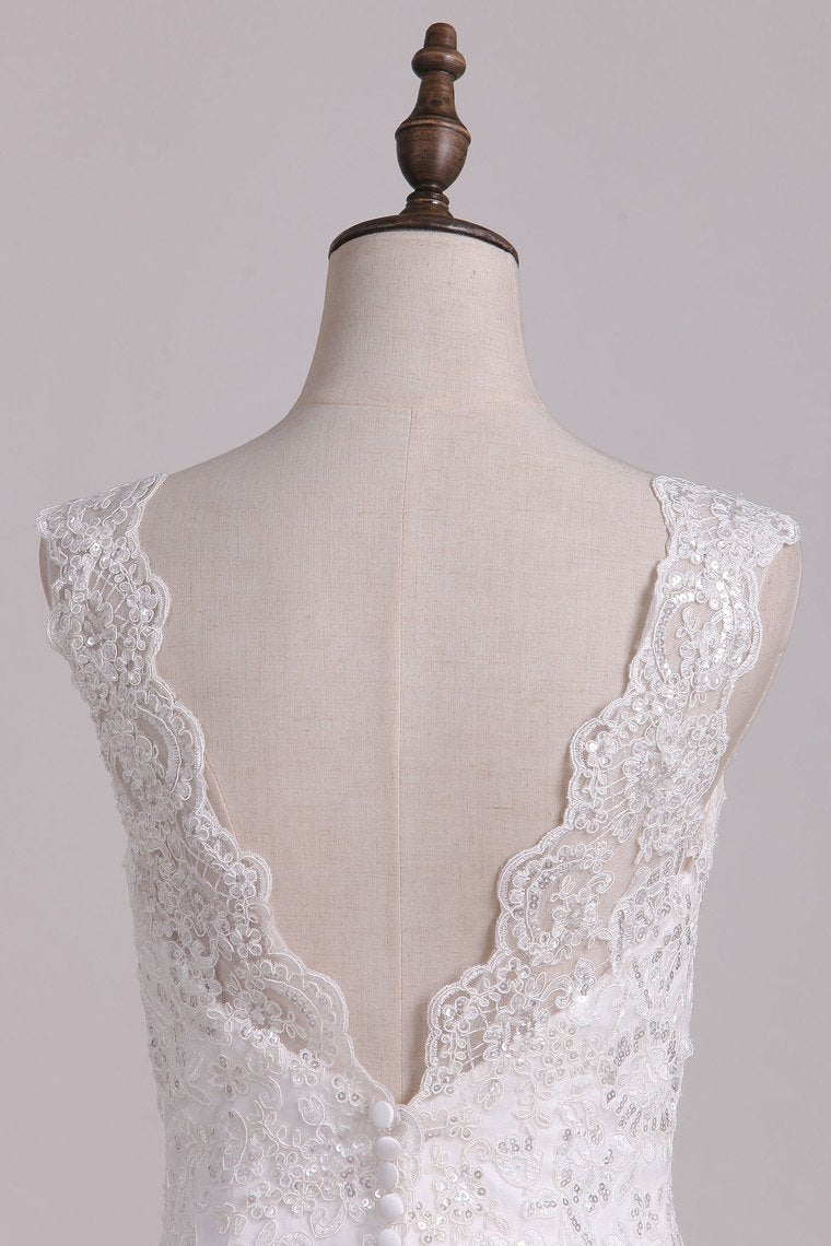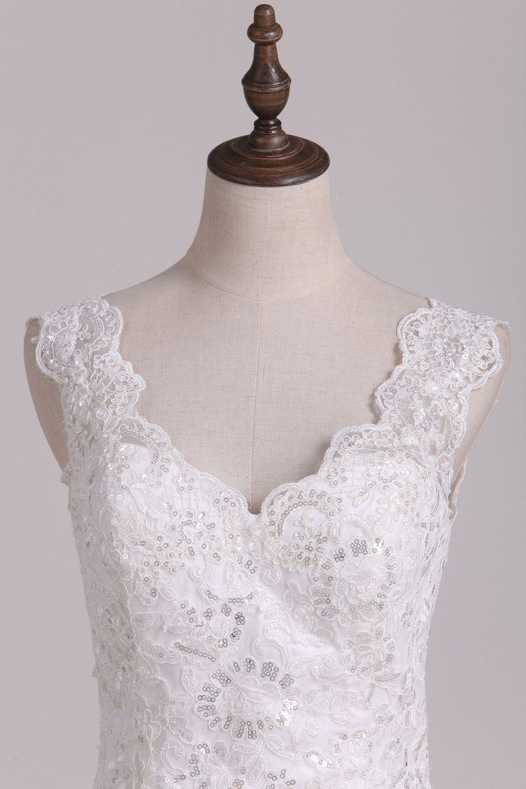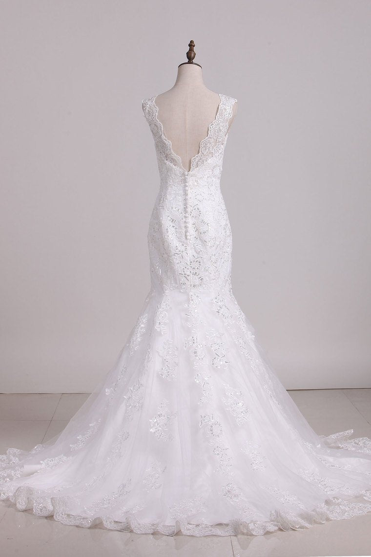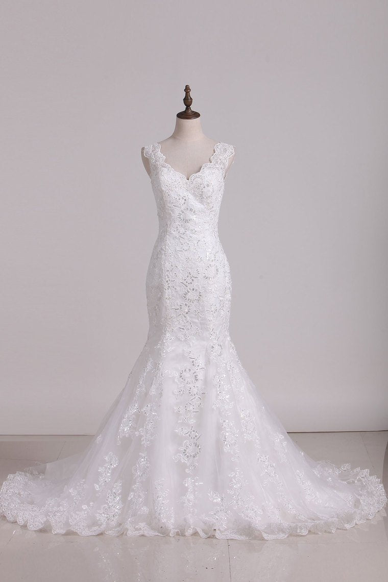 2024 Wedding Dress V Neck With Applique Mermaid/Trumpet Tulle Chapel Train