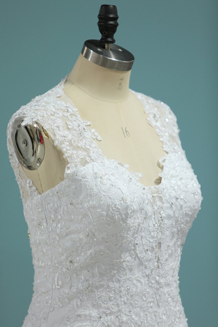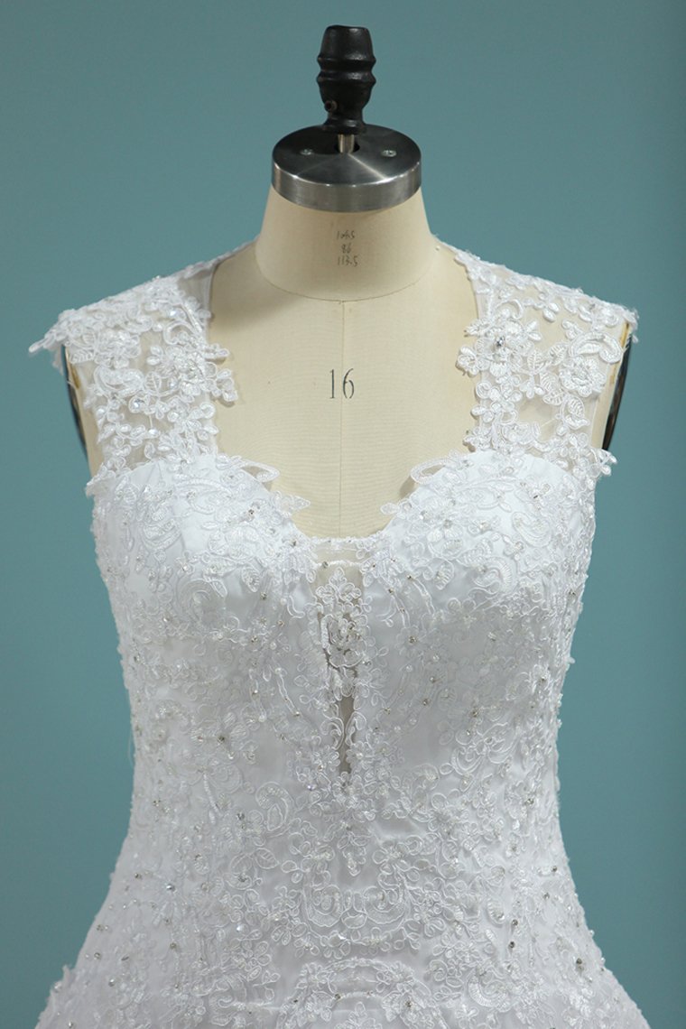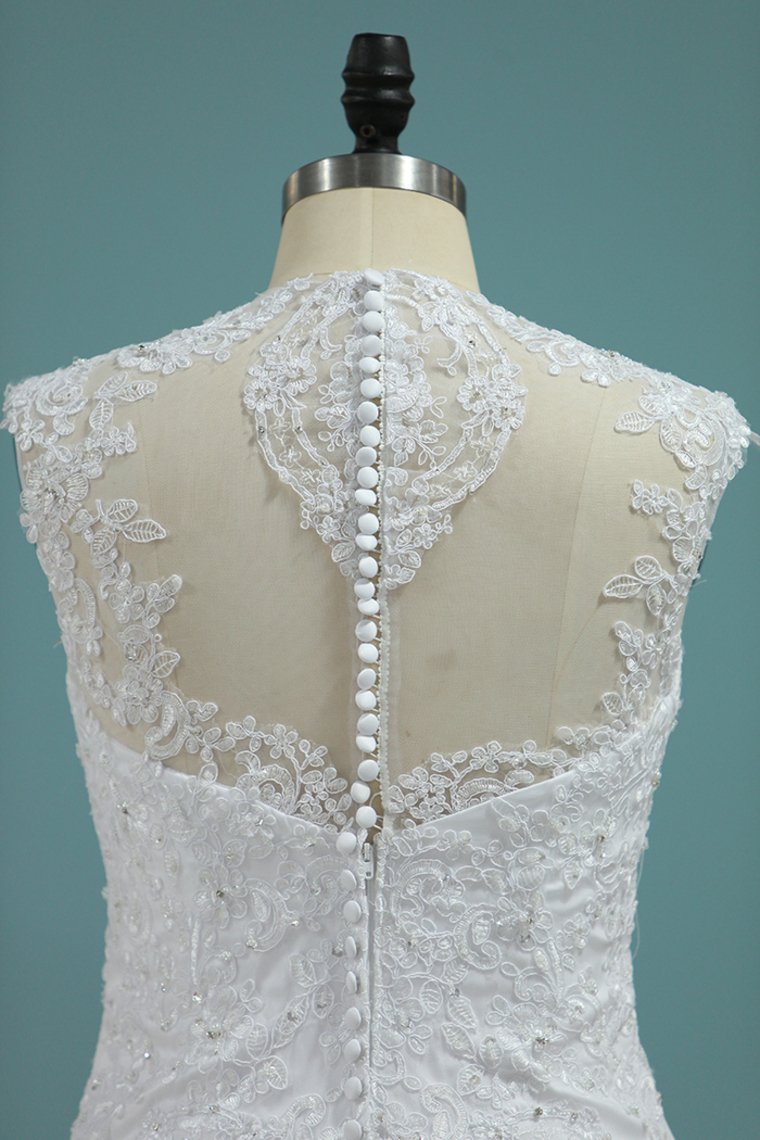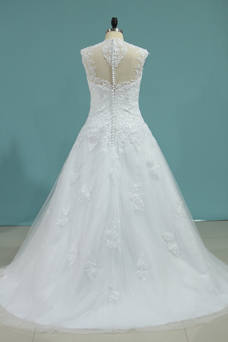 2024 Wedding Dresses A-Line High Neck Court Train Satin With Applique Covered Buttons