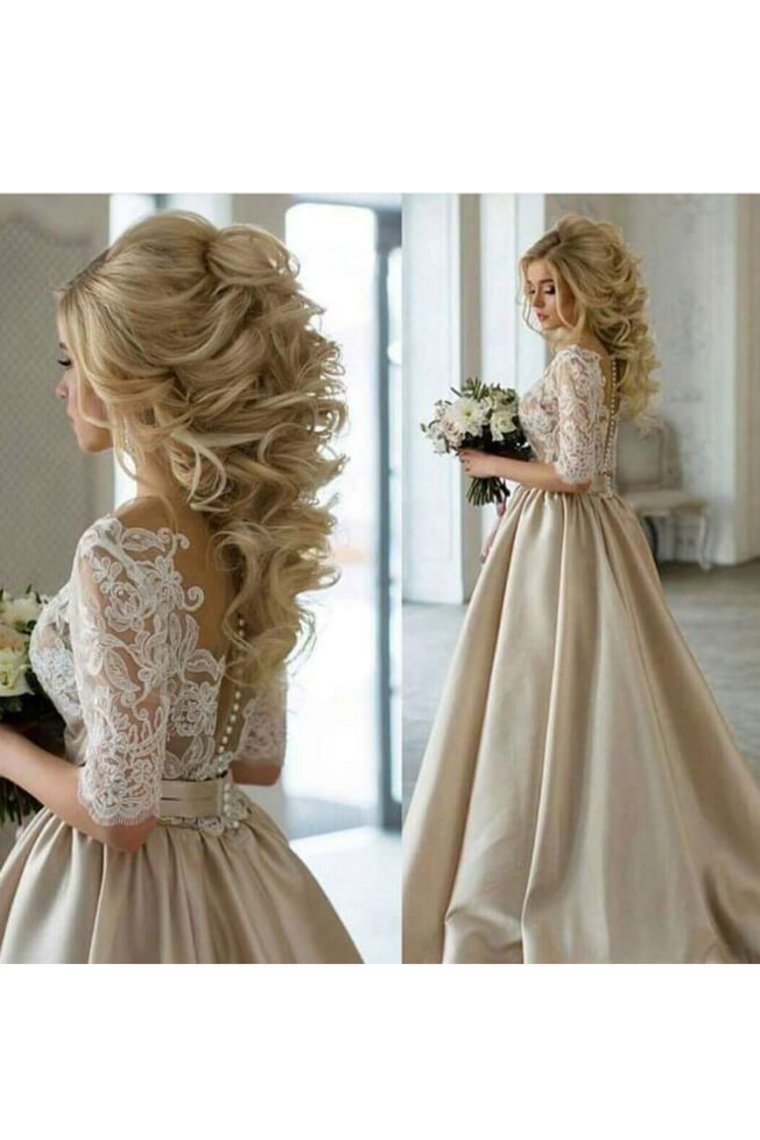 2024 Wedding Dresses A Line Scoop Mid-Length Sleeves Satin With Applique