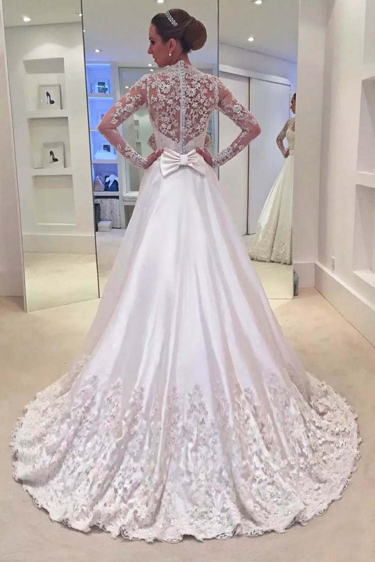 2024 Wedding Dresses A Line V Neck Stretch Satin With Applique Long Sleeves