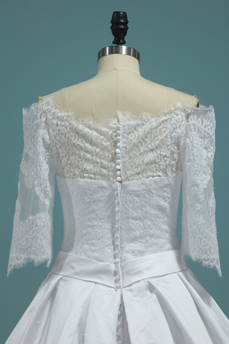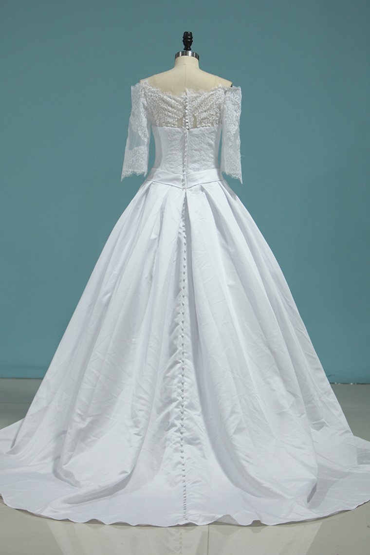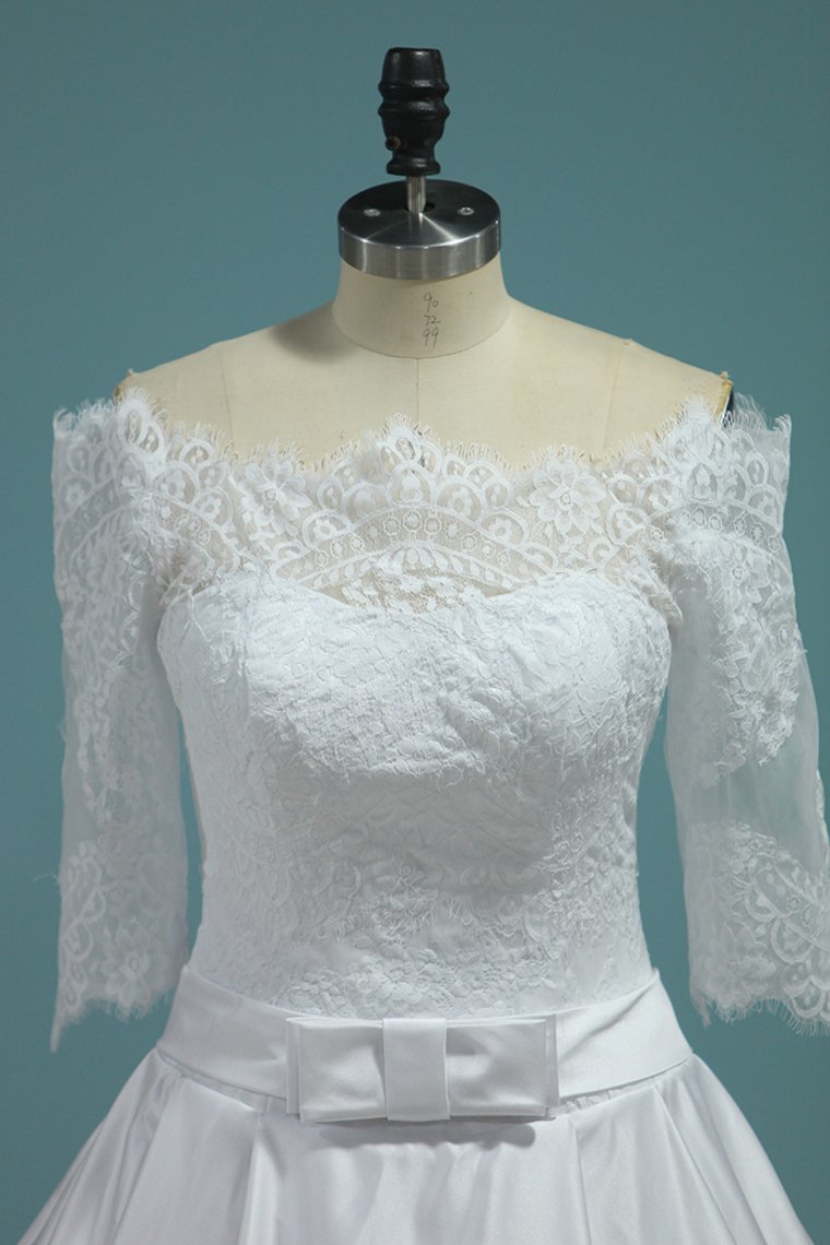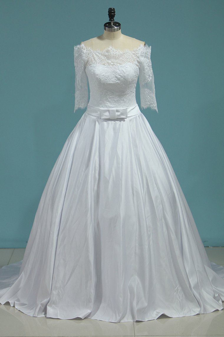 2024 Wedding Dresses Boat Neck Satin With Applique And Sash A Line