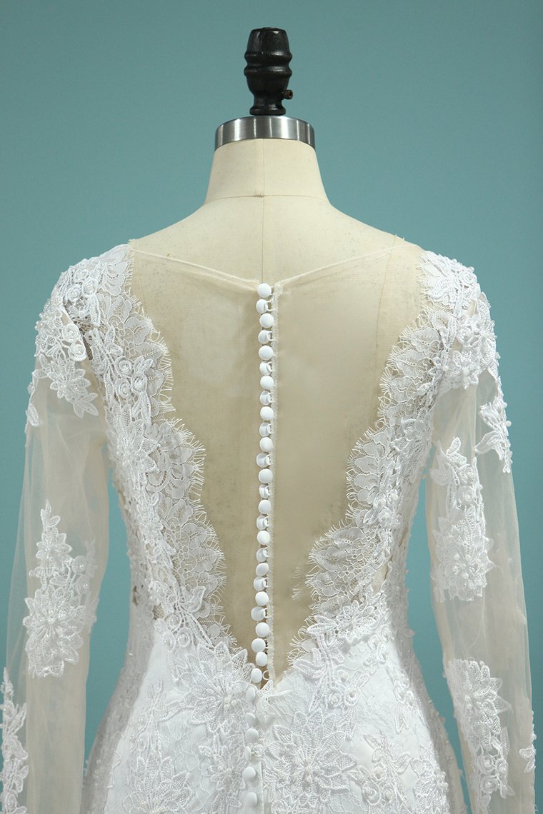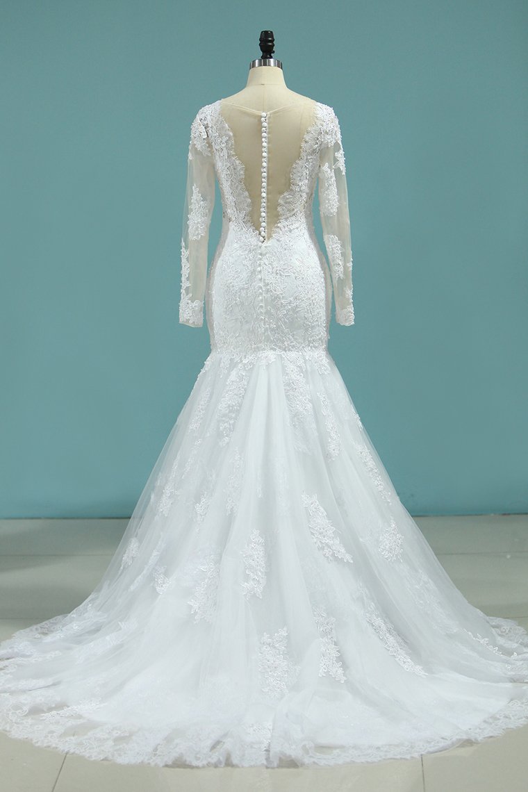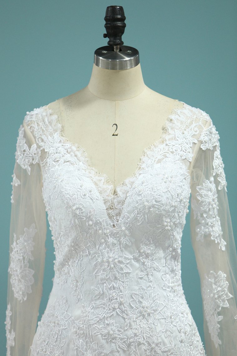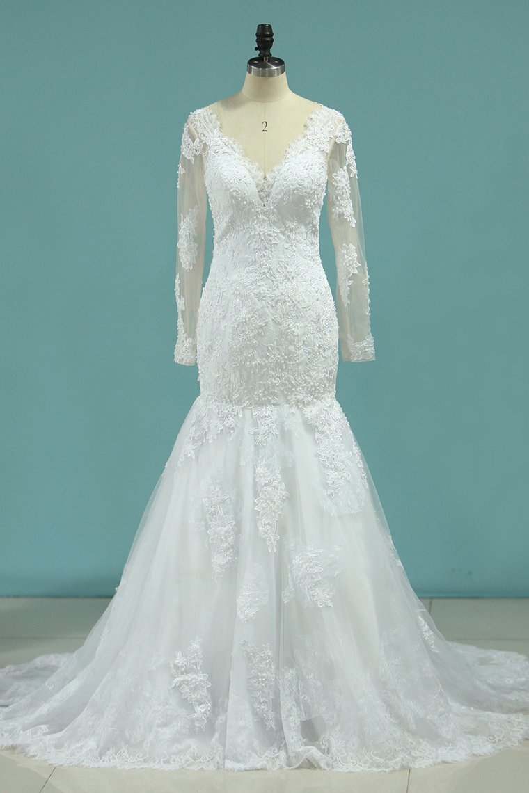 2024 Wedding Dresses Long Sleeves V Neck Mermaid Tulle With Applique