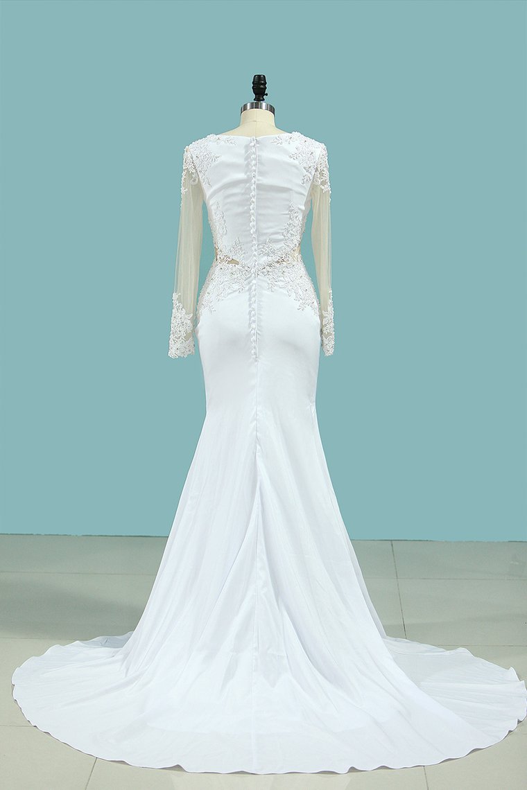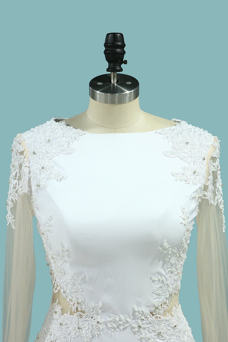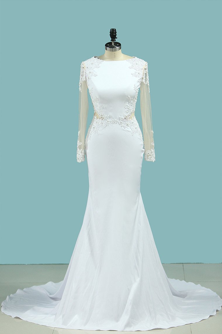 2024 Wedding Dresses Mermaid Scoop Long Sleeves Elastic Satin With Appliuque