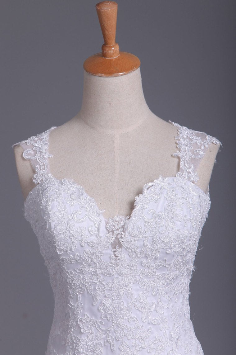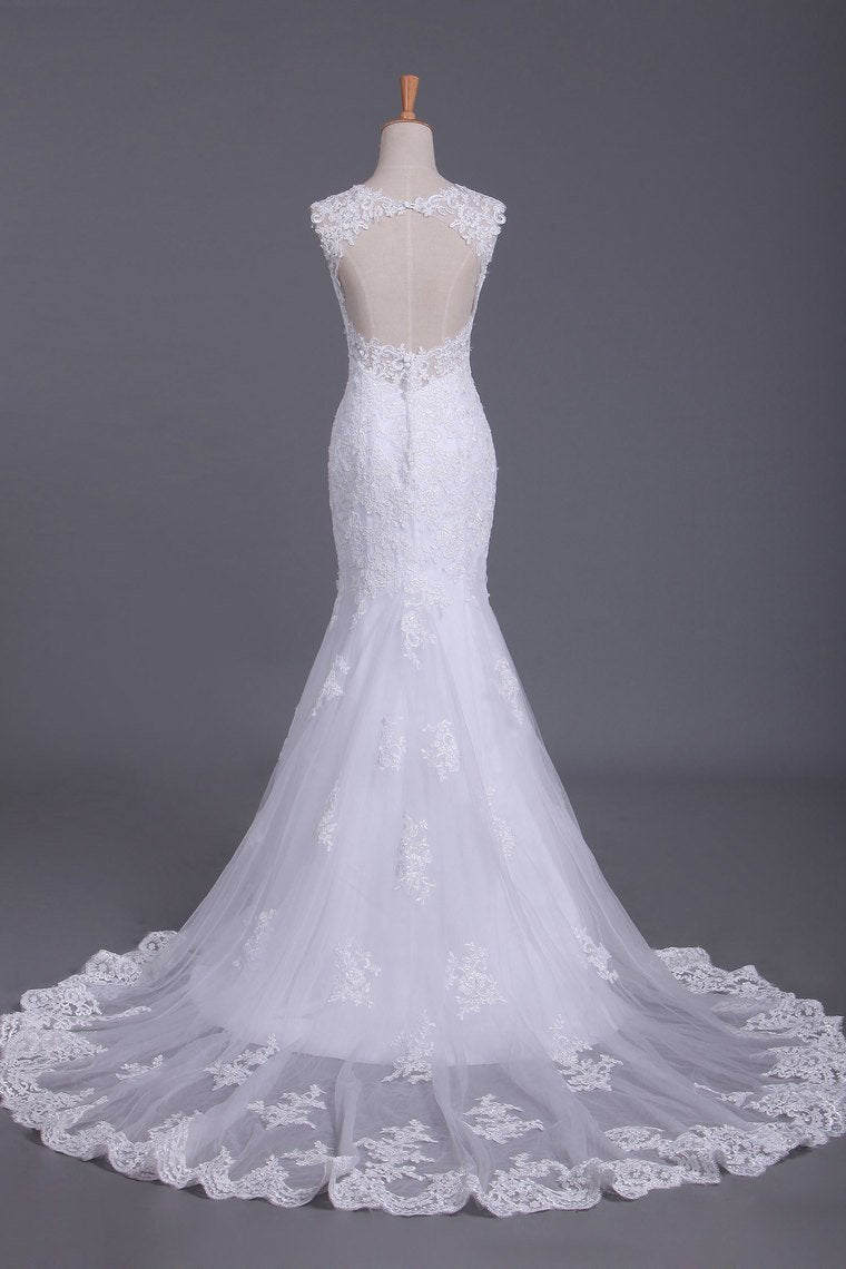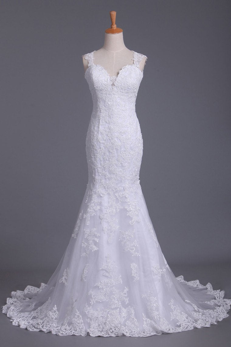 2024 Wedding Dresses Mermaid Straps Tulle With Applique Court Train Open Back