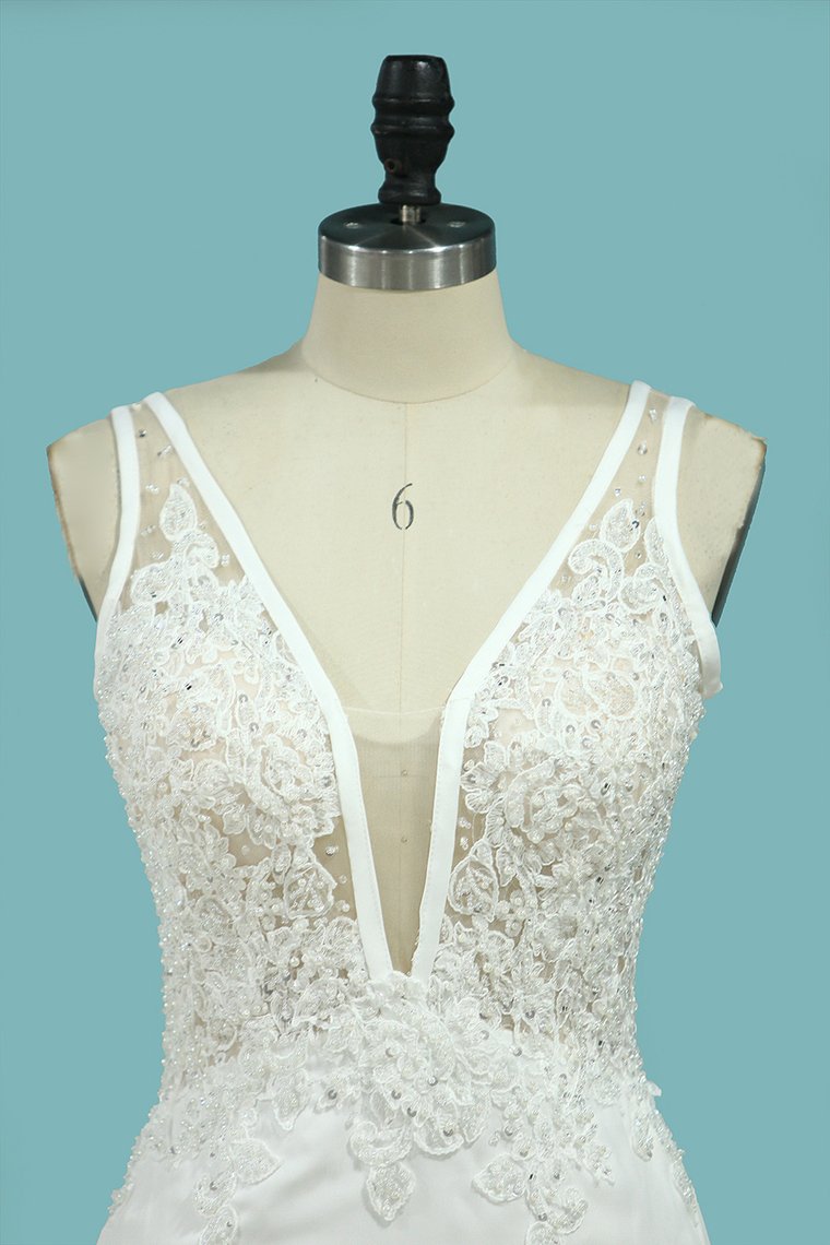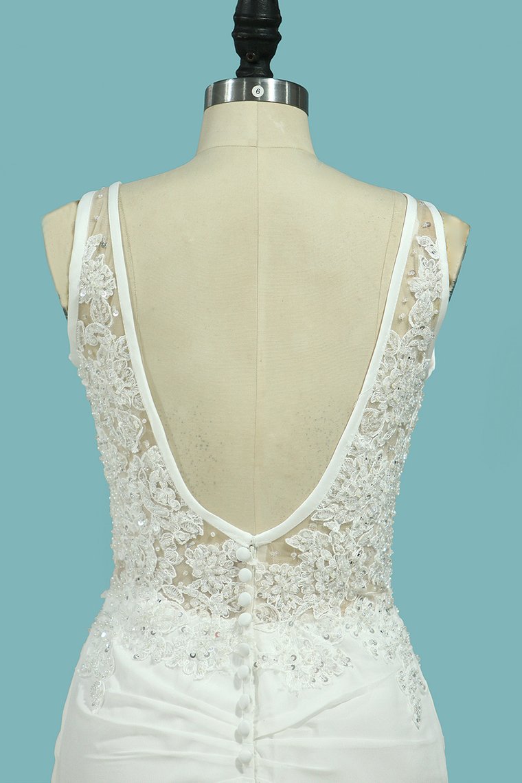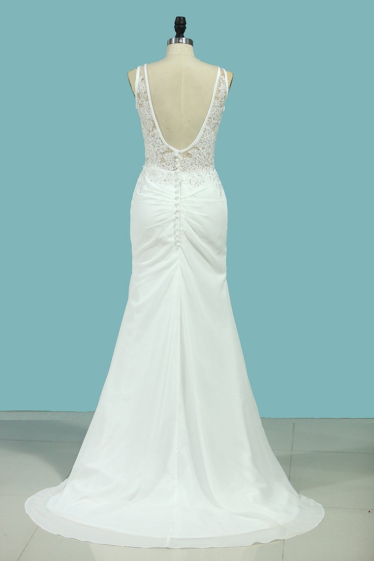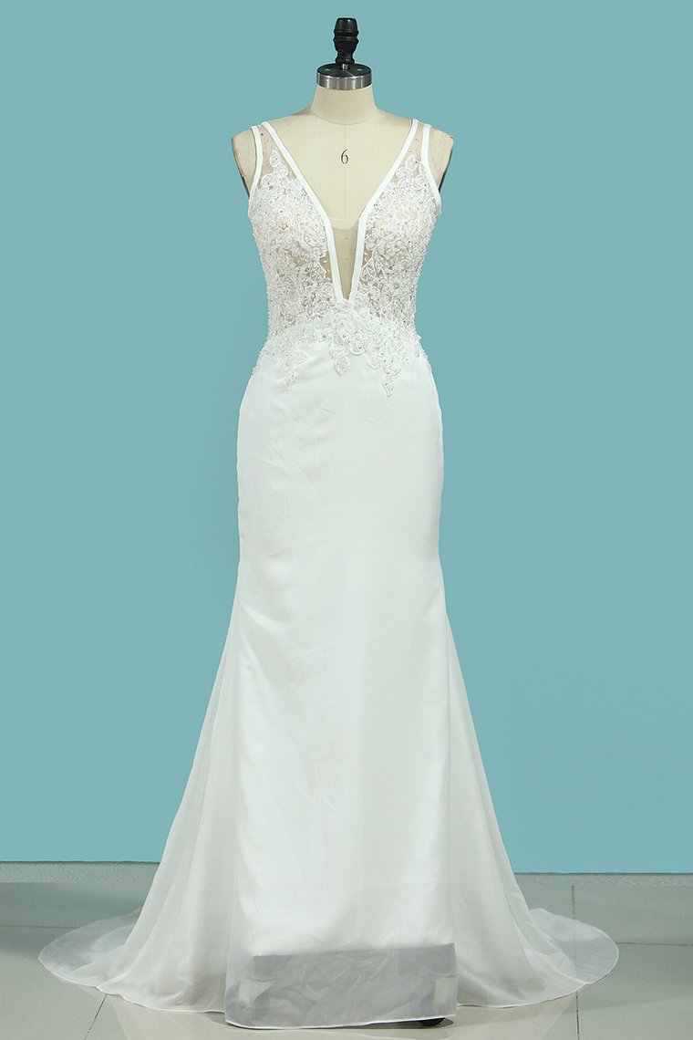 2024 Wedding Dresses Mermaid V Neck Chiffon With Applique Open Back