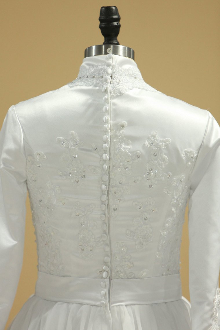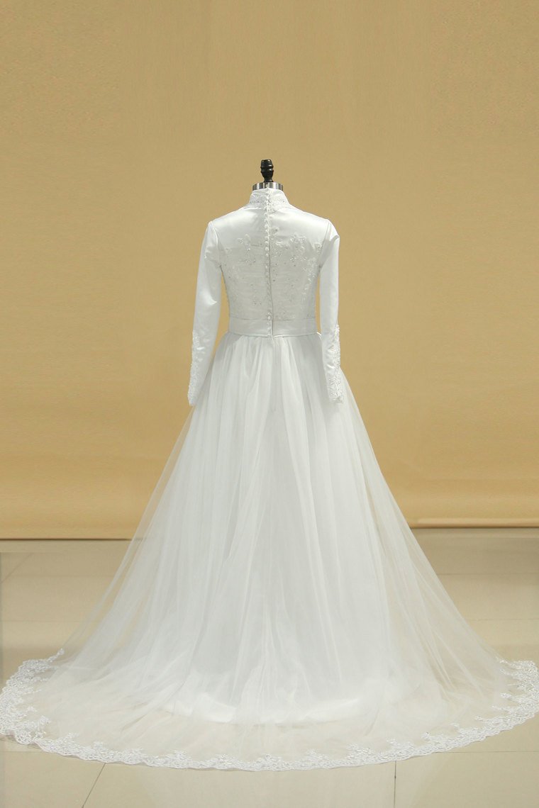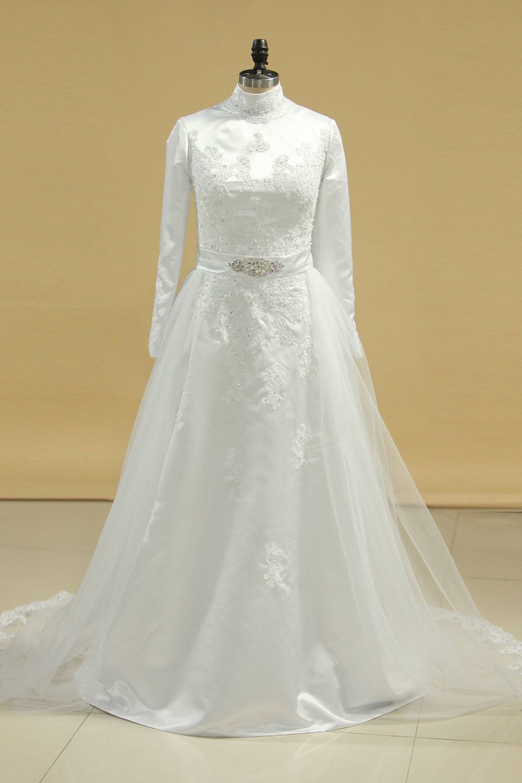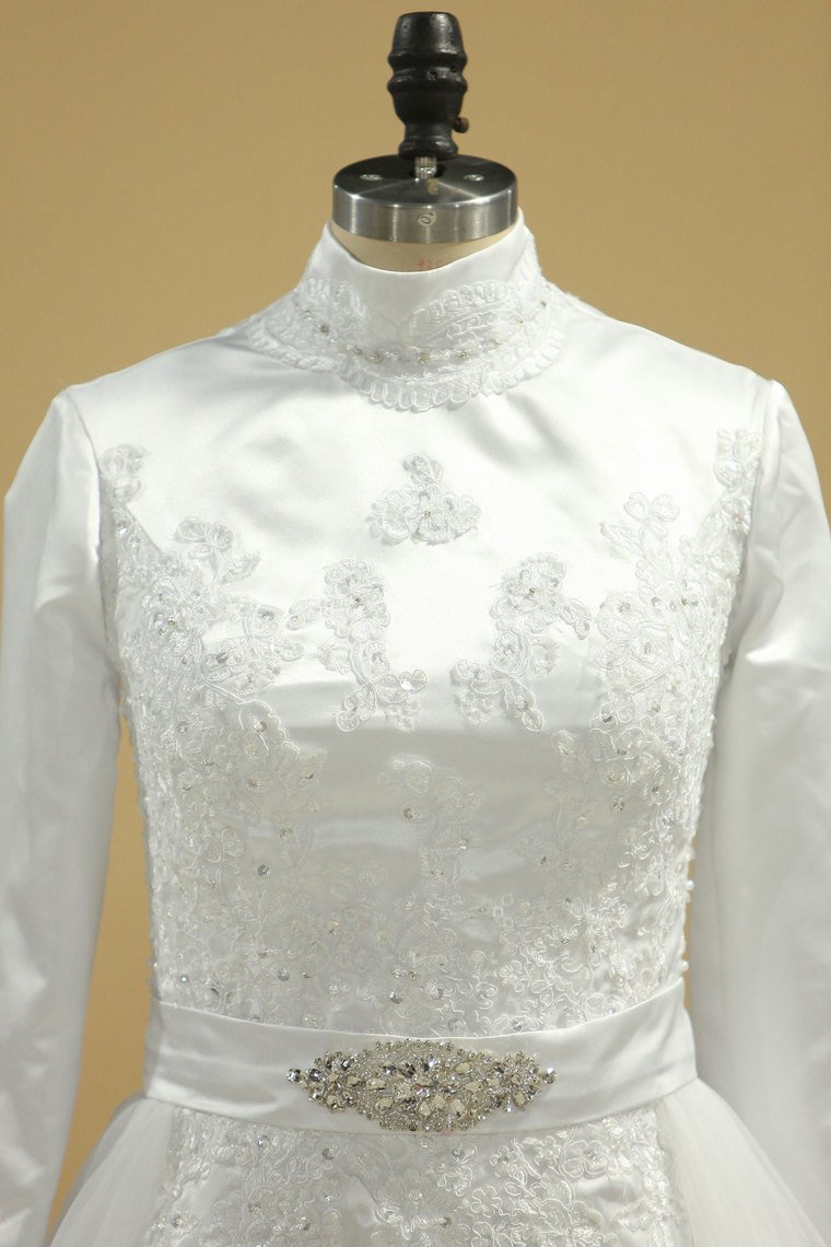 2024 Wedding Dresses Muslim High Neck Sheath Satin & Tulle With Applique