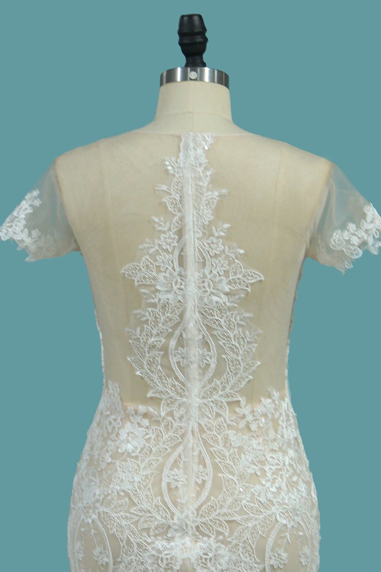 2024 Wedding Dresses Scoop Short Sleeve Mermaid Tulle With Applique Court Train