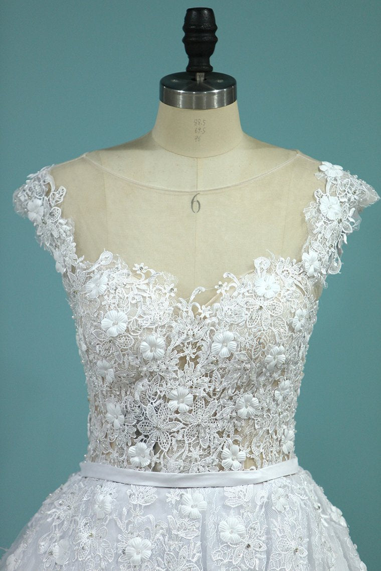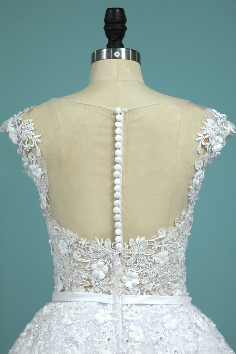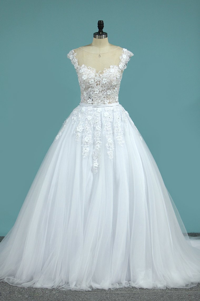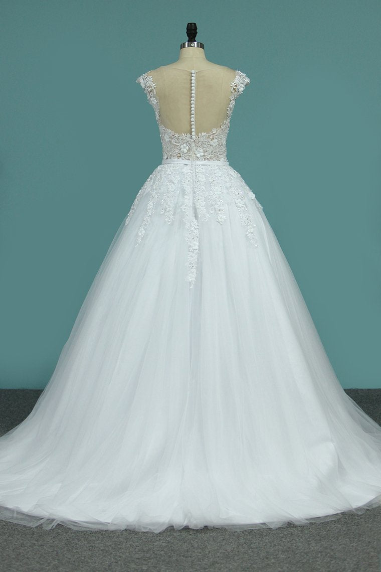 2024 Wedding Dresses Scoop Tulle With Applique A Line Chapel Train