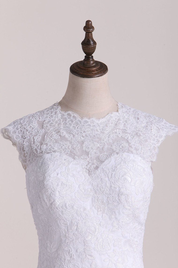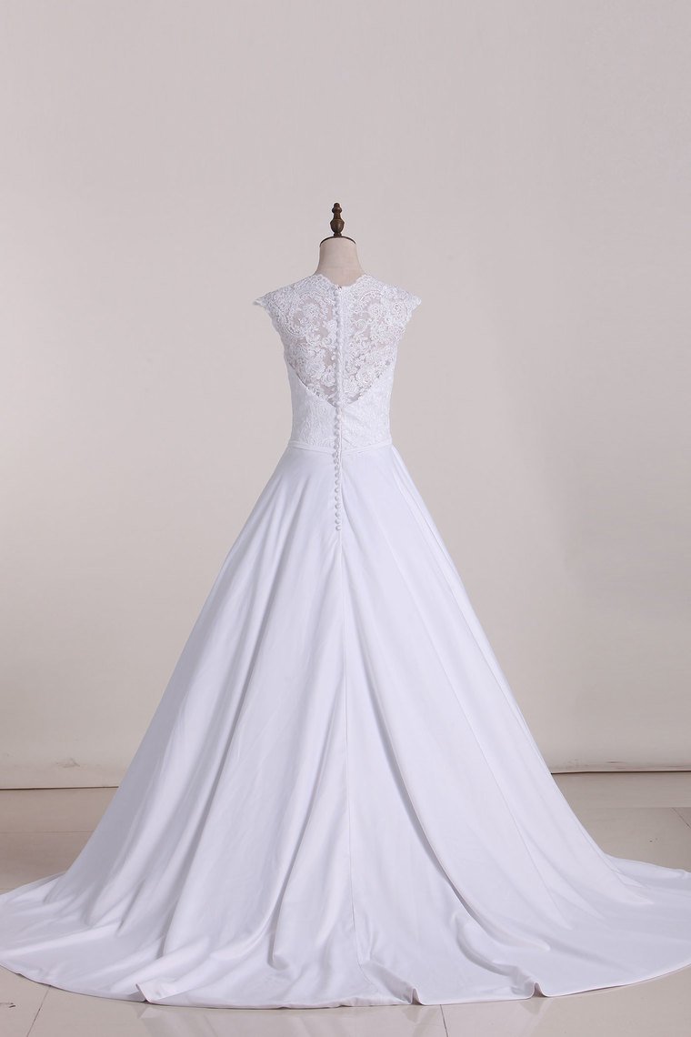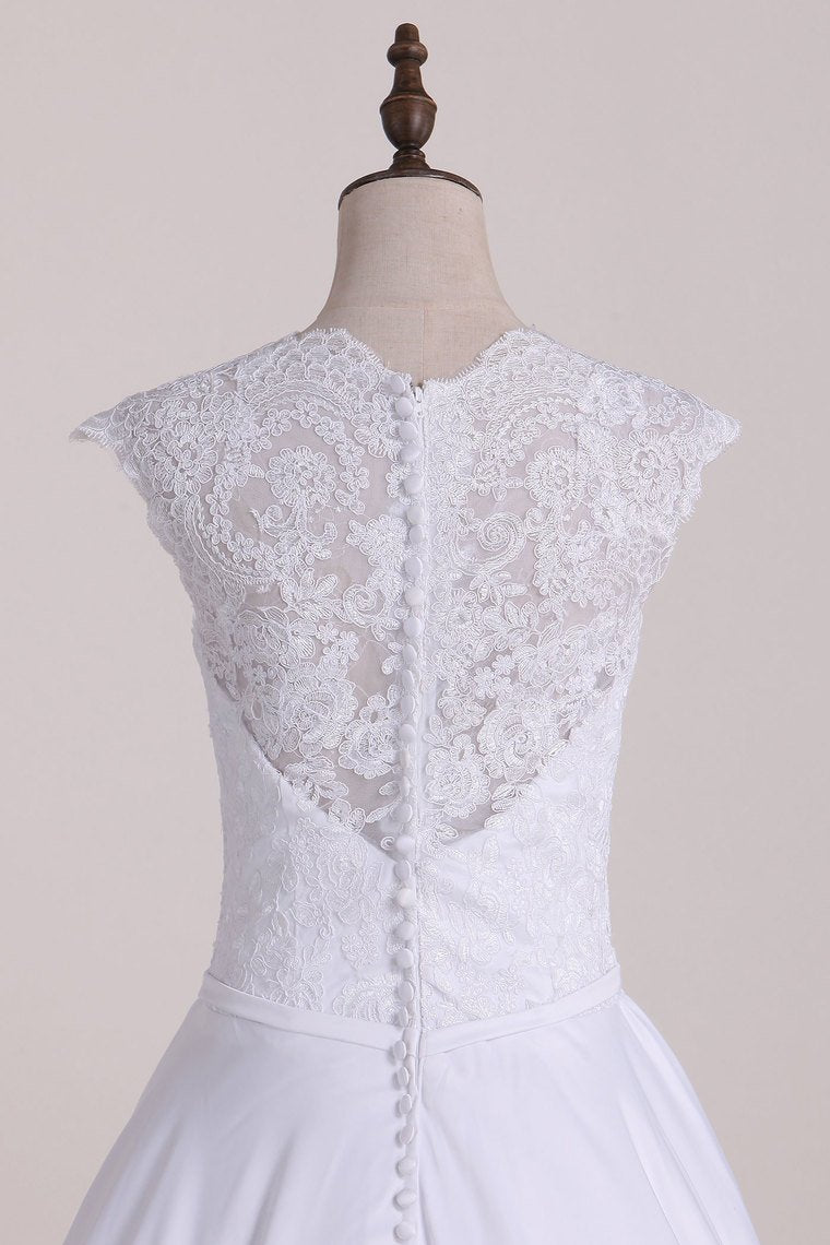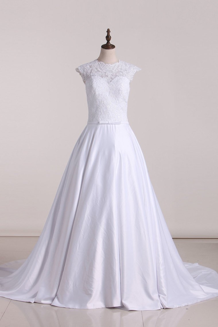 2024 Wedding Dresses Scoop With Applique And Sash A Line Stretch Satin