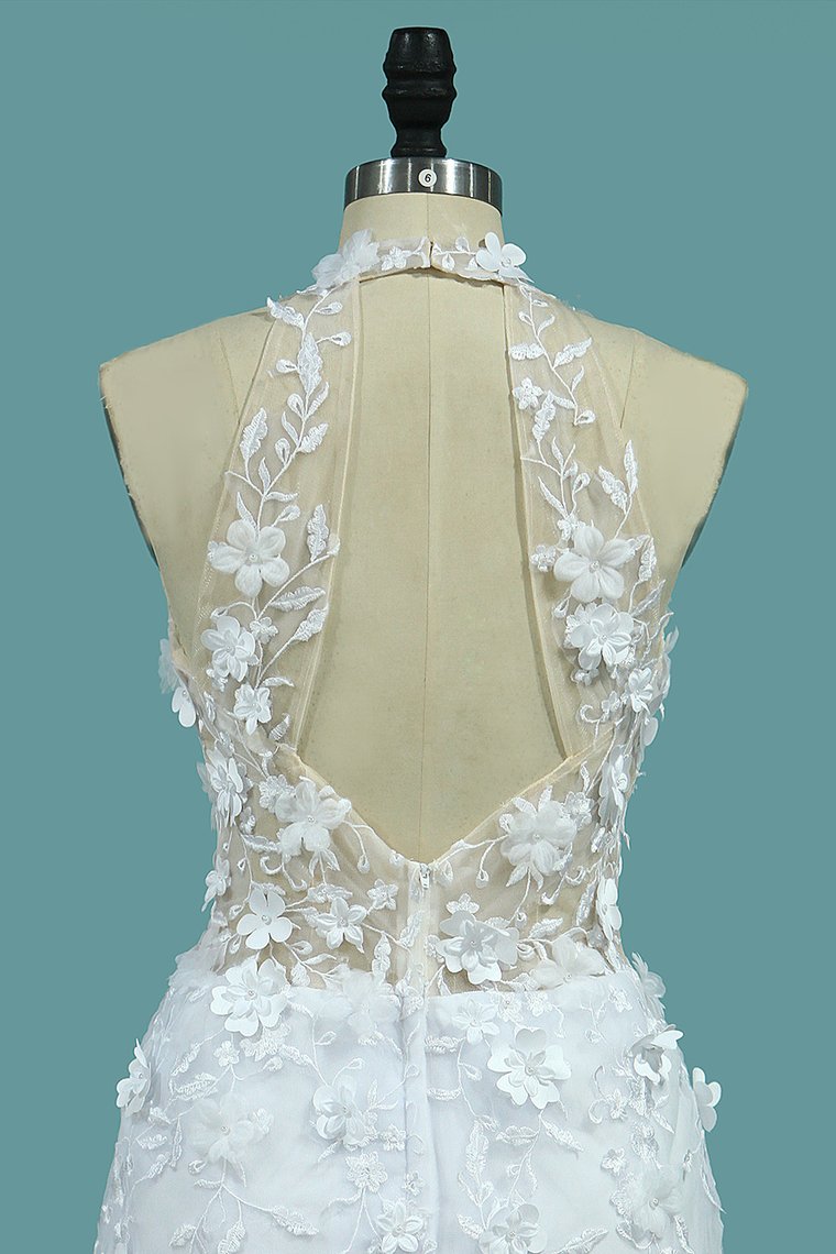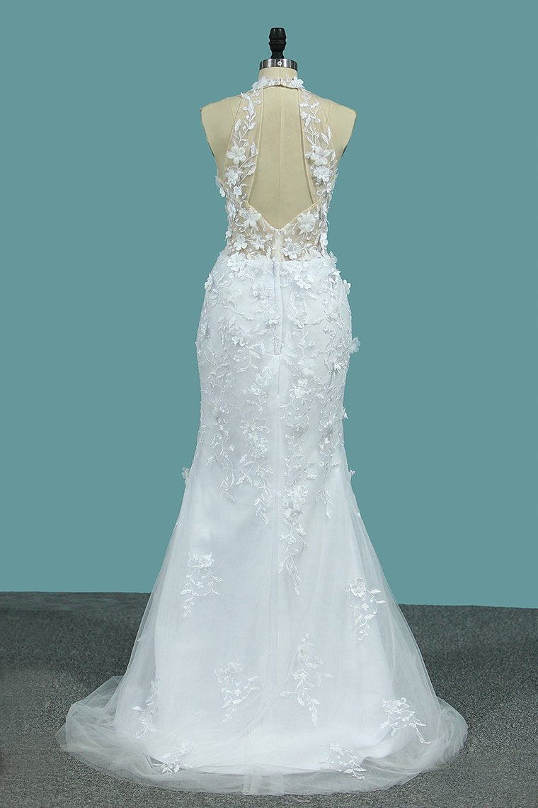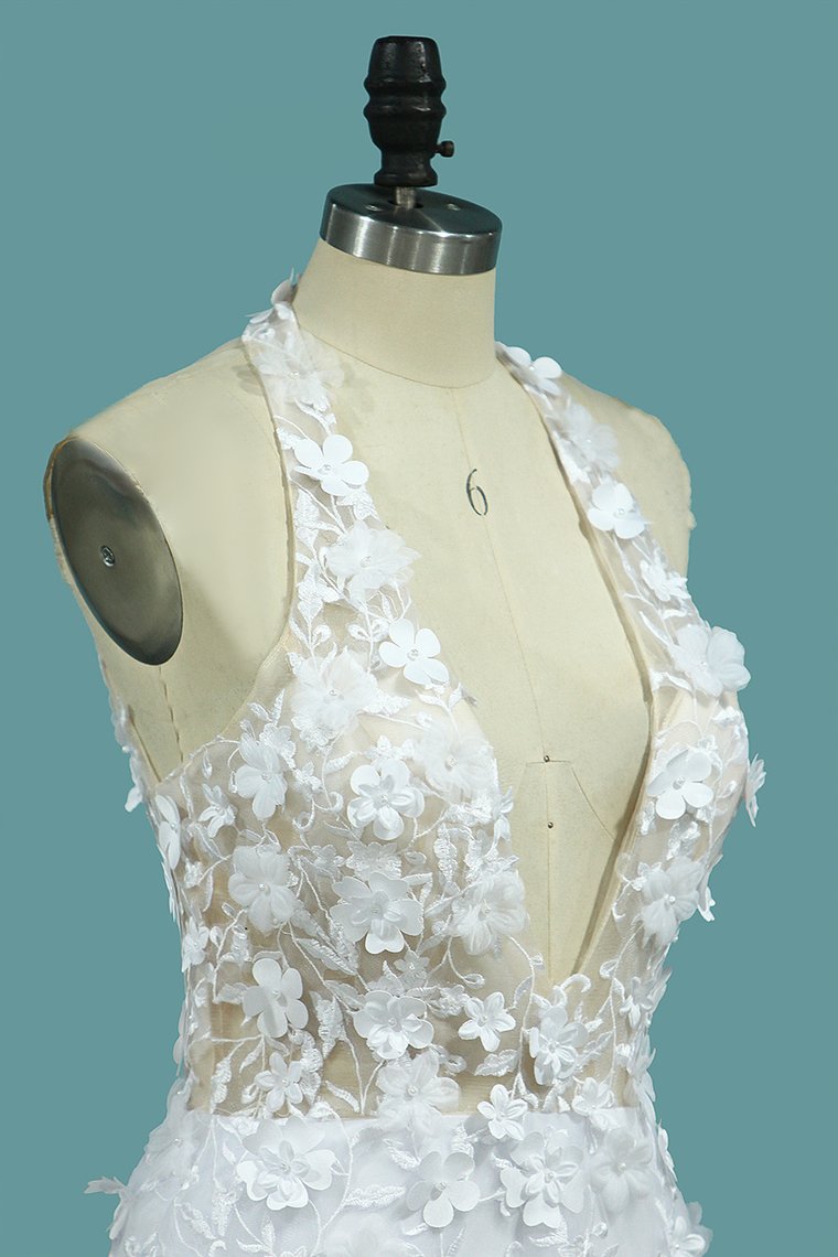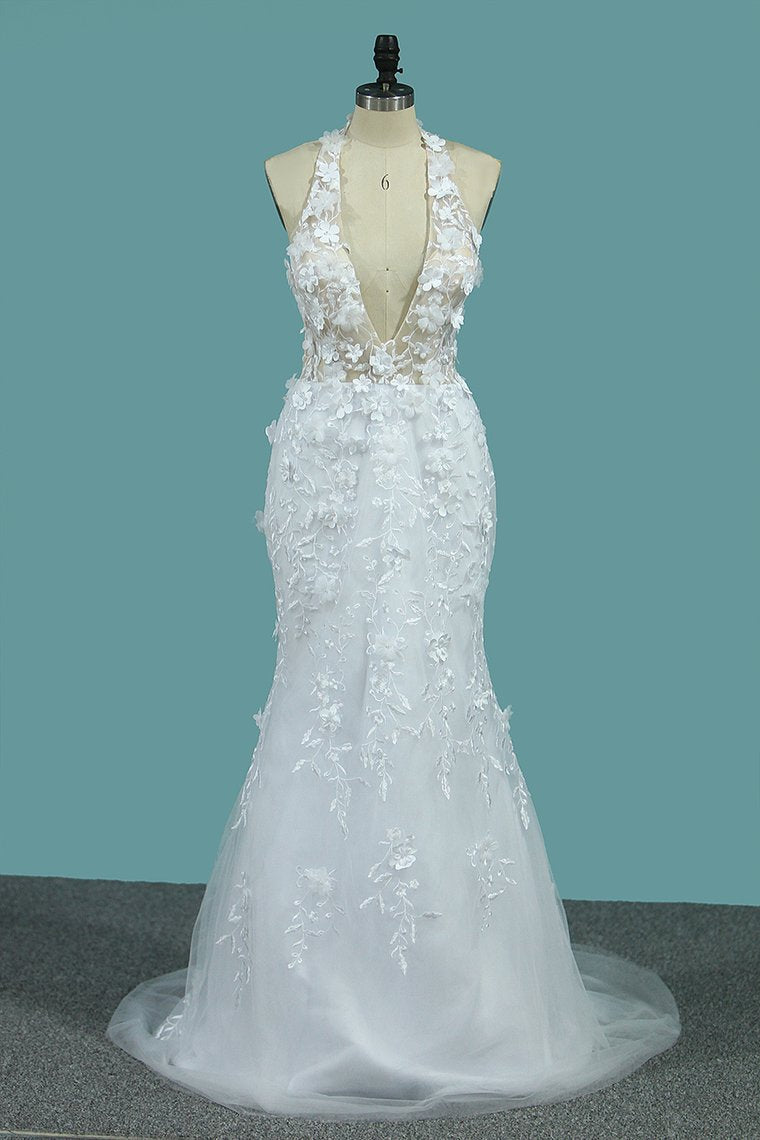 2024 Wedding Dresses V Neck Mermaid Tulle With Applique And Handmade Flowers