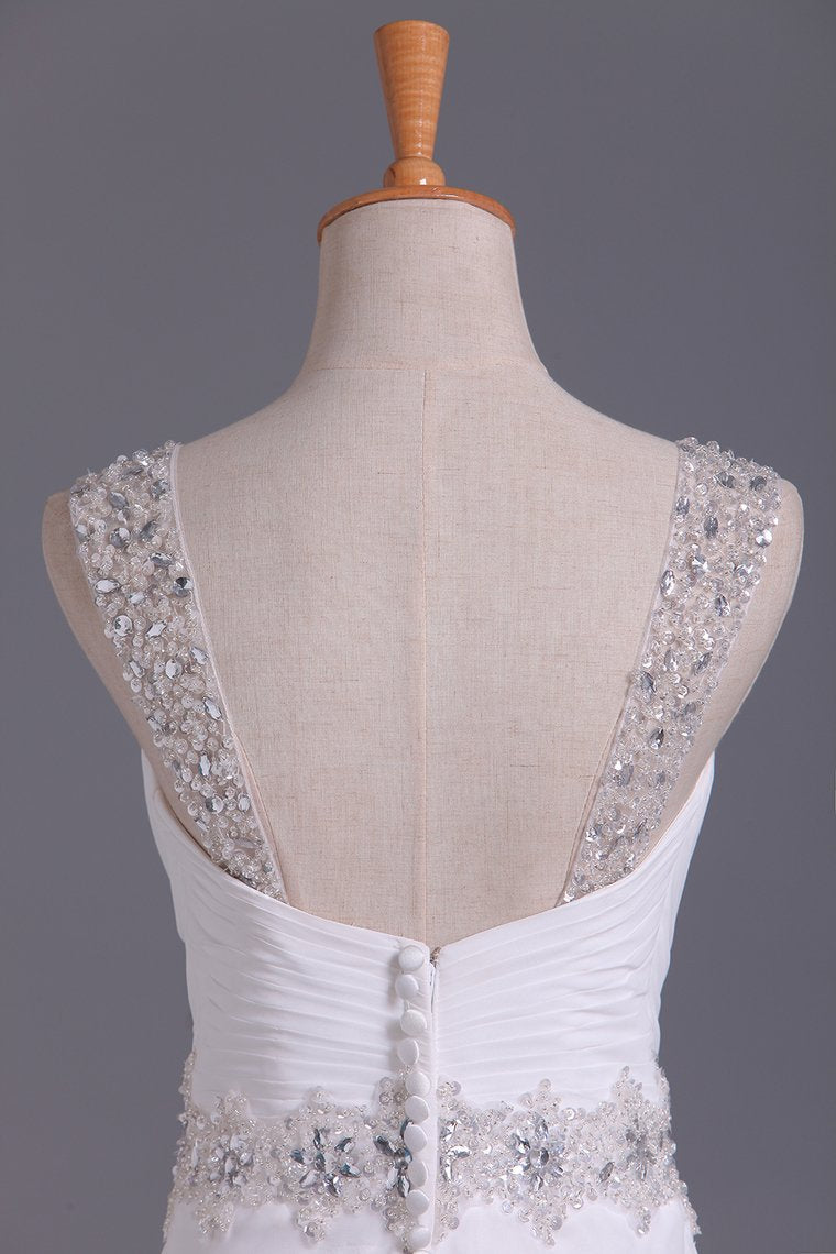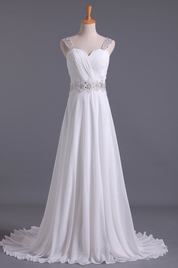 2024 White Wedding Dress Sweetheart A Line Pleated Bodice With Detachable Straps Beaded Chiffon