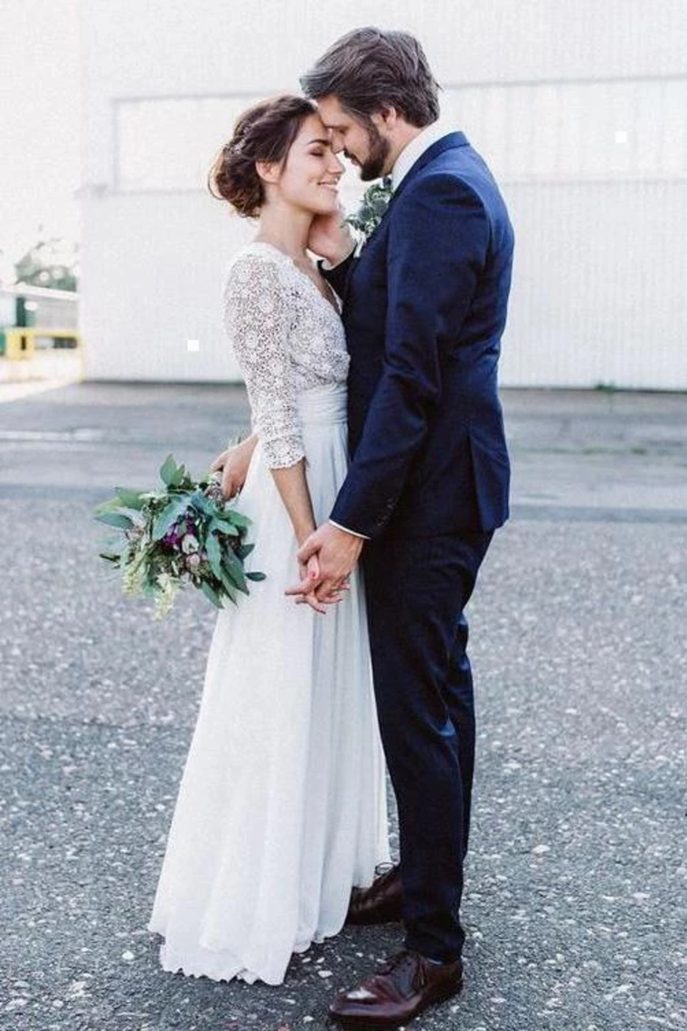 3/4 Sleeves Chiffon Beach Wedding Dress With Lace, V Neck Backless Bridal Dress