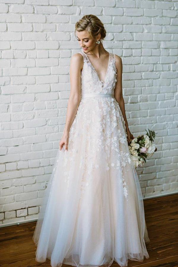 A Line Ivory Lace Long V Neck Beach Wedding Dress with Appliques Bridal Dresses RS232