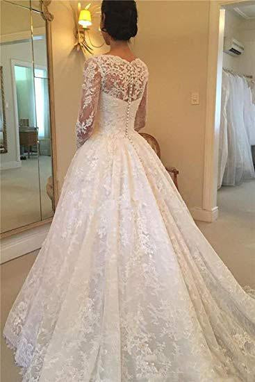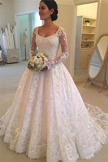 A Line Lace Applique Long Sleeve Sweetheart Covered Button Wedding Dresses RS331