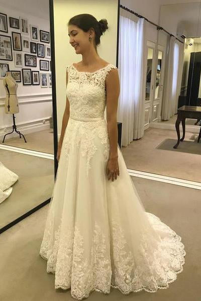 A Line Lace Appliques Tulle Ivory Scoop Long Wedding Dresses Cheap Bridal Dresses RS200