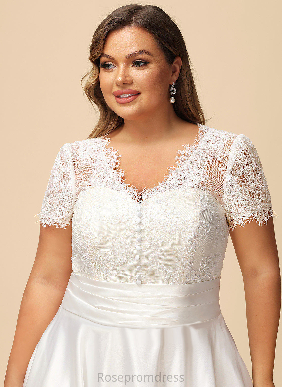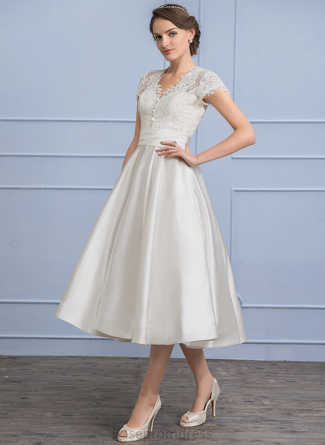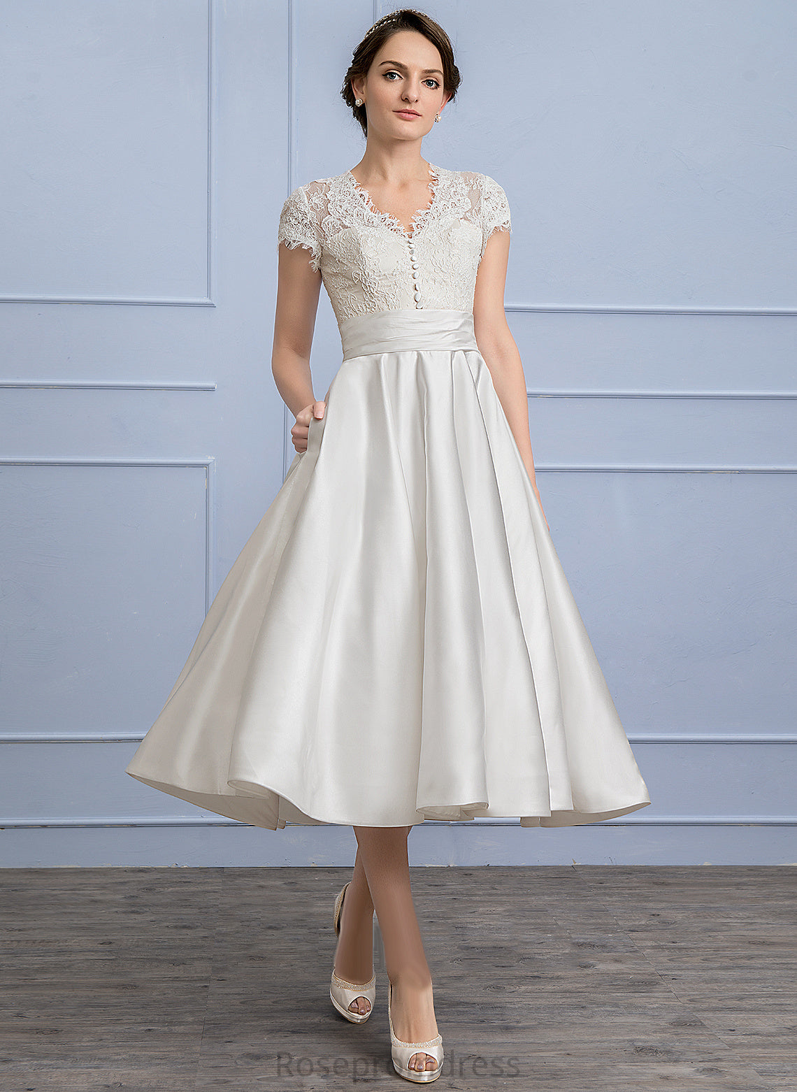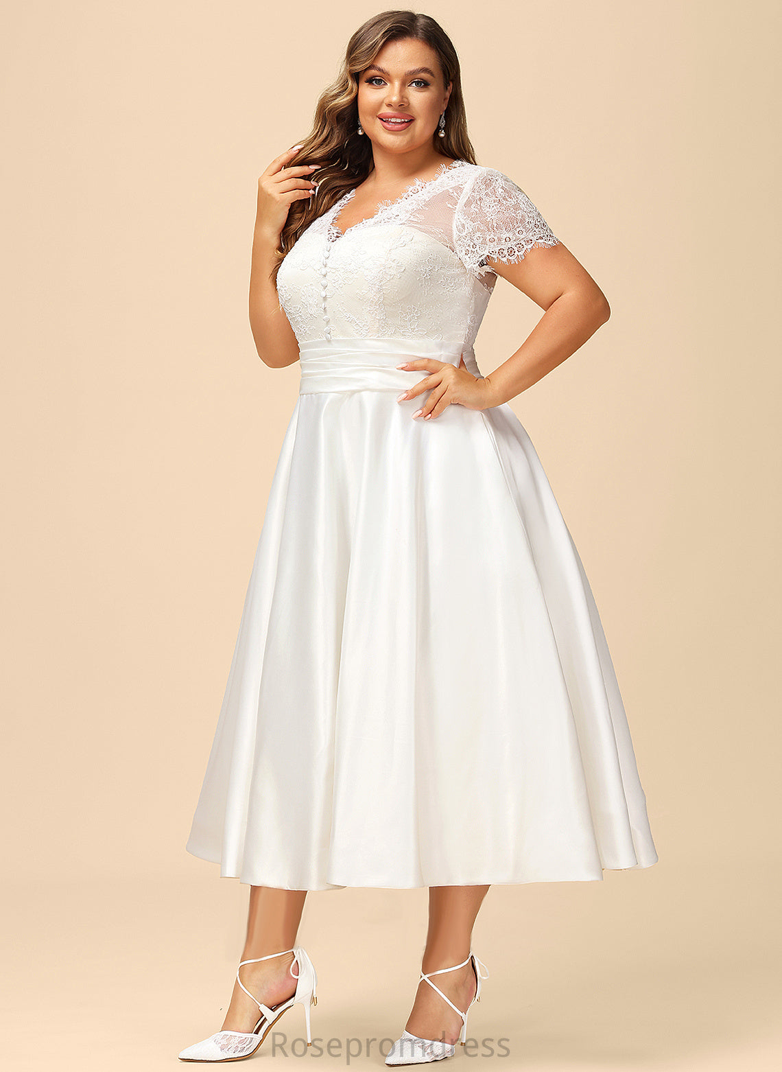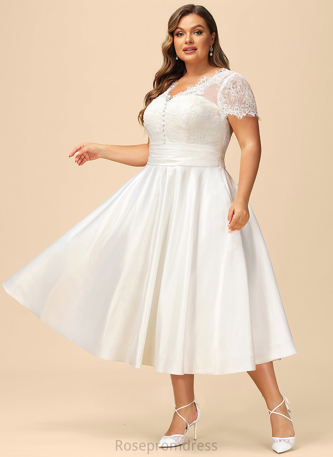 A-Line Lace Satin Ruffle Dress Tea-Length Wedding With Evangeline Wedding Dresses Pockets V-neck