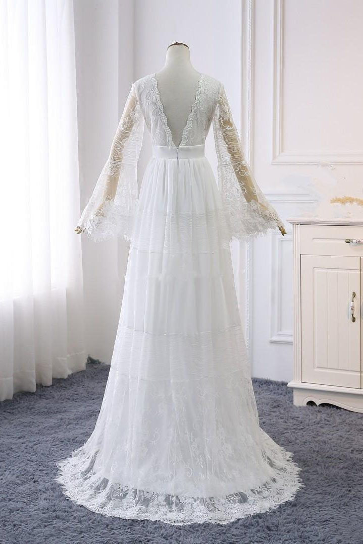 A line Long Sleeve V Neck Lace Ivory Wedding Dresses V Neck Beach Bridal Dresses W1010